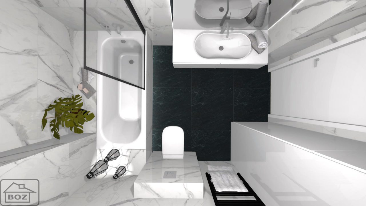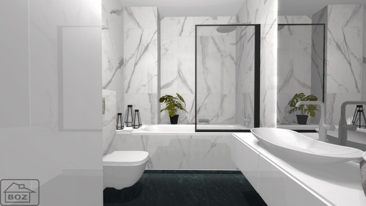 Biała łazienka nabierze charakteru dzięki połączeniu jasnych marmurowych płytek z kontrastową, ciemną podłogą. Wzór czarnych płytek jest punktem odniesienia dla kolejnych elementów aranżacji. Dopasowane dodatki – parawan nawannowy i grzejnik – łączą wnętrze w harmonijną całość.