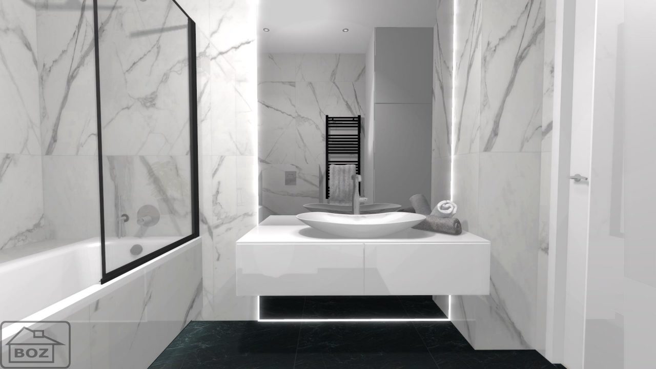 Podstawą tej aranżacji są płytki Tubądzin Pietrasanta imitujące marmur. Biel płytki została przełamana subtelnym, ciemniejszym żyłkowaniem, które przypomina strukturę naturalnego kamienia. Estetyka wzmocniona błyszczącym wykończeniem wprowadza do pomieszczenia nutę luksusu i elegancji.