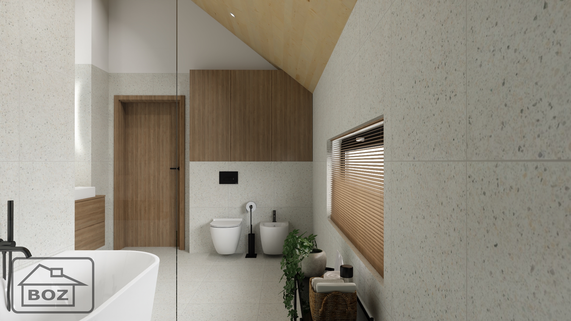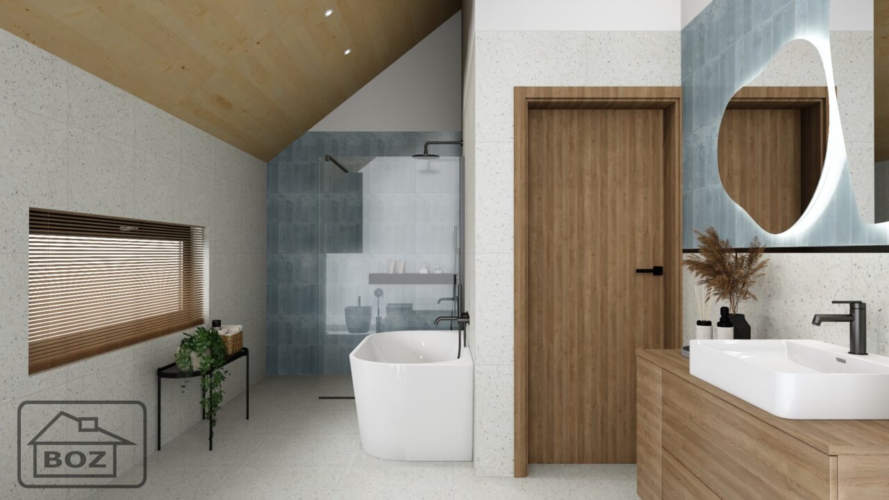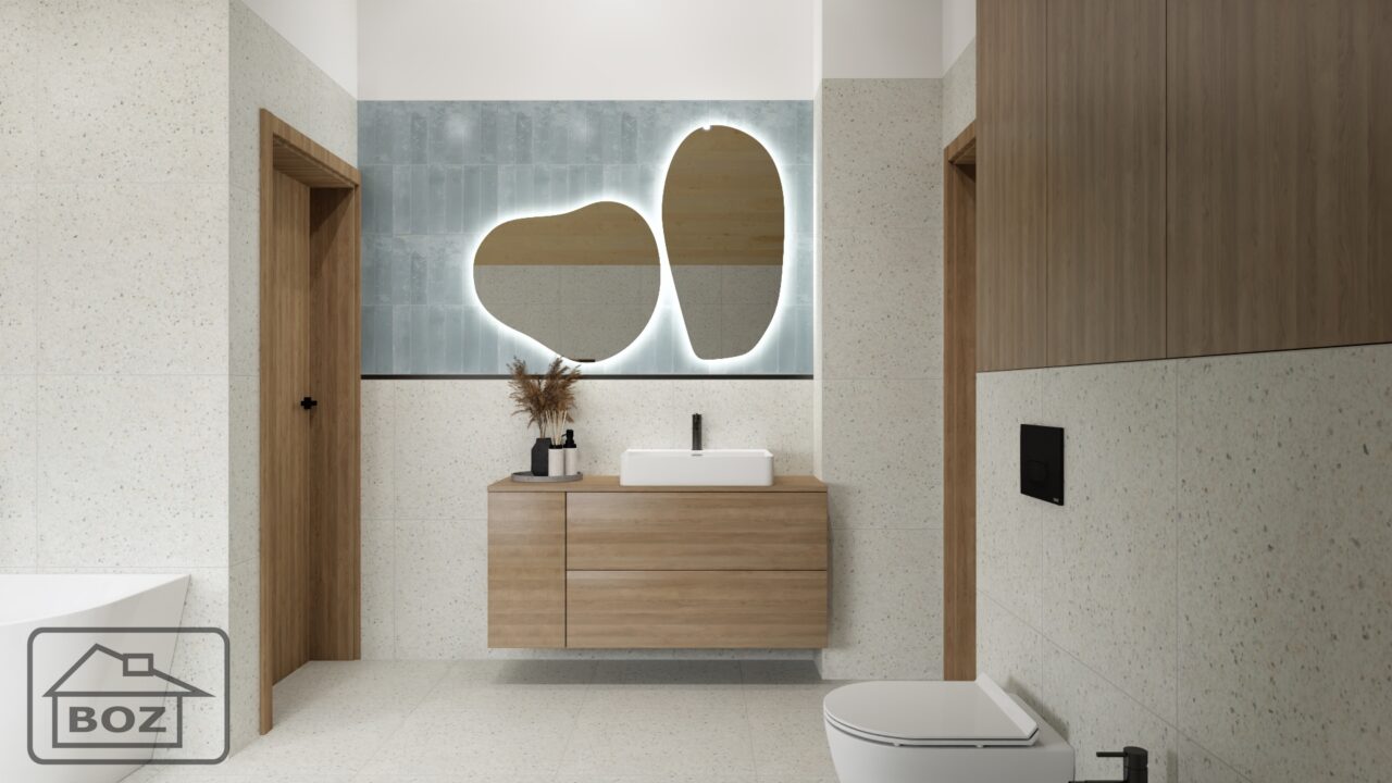 Oryginalne dodatki to klucz do stworzenia niebanalnej łazienki. Lustra w nieregularnym kształcie nie tylko pełnią praktyczną funkcję, ale także stają się designerskim akcentem, wnosząc do wnętrza odrobinę ekspresji. W centrum uwagi znajduje się wanna wolnostojąca przyścienna, która idealnie pasuje do minimalistycznej stylistyki. Jej subtelna forma nadaje pomieszczeniu lekkości, jednocześnie zapewniając wygodę użytkowania.