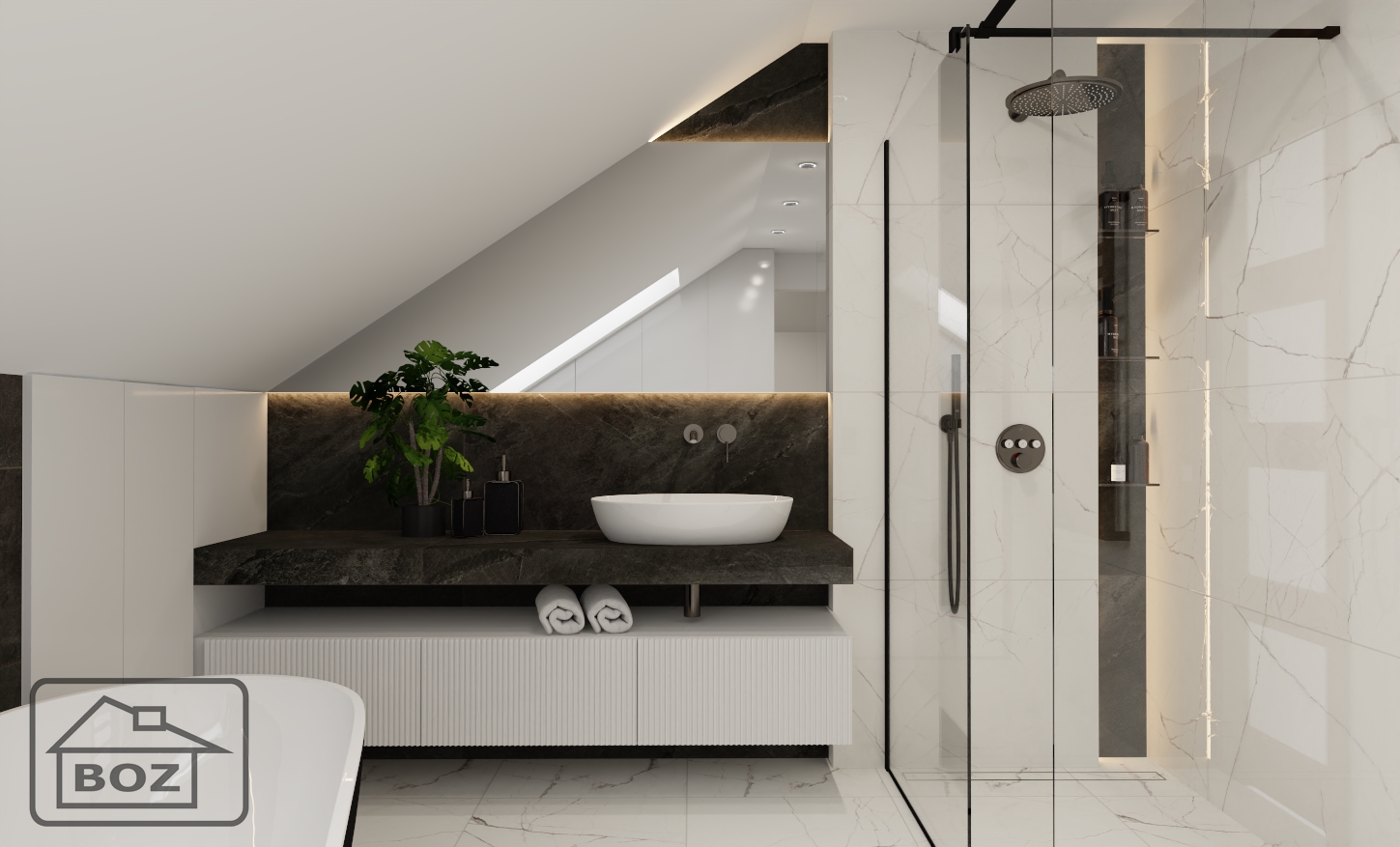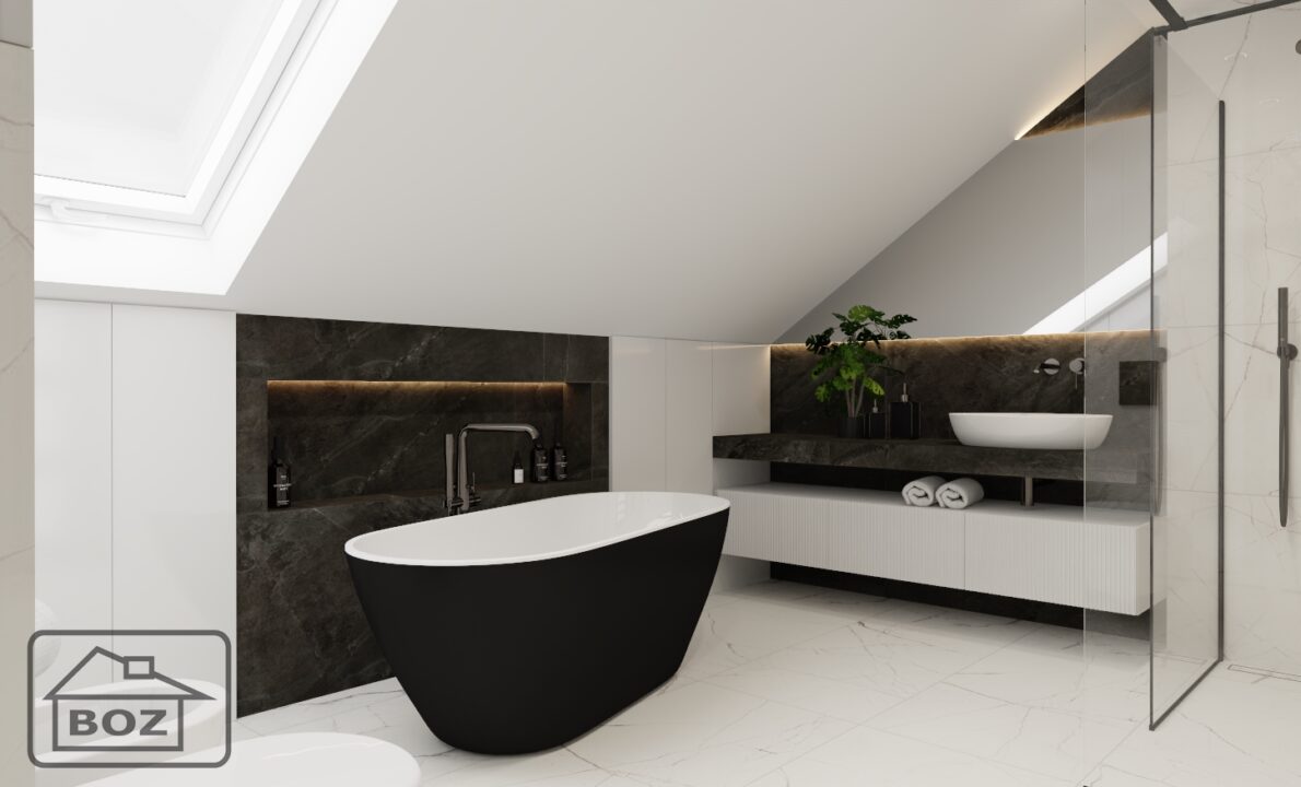 Centralnym punktem aranżacji jest bez wątpienia wanna wolnostojąca o matowym, czarnym wykończeniu. Jej opływowy kształt i minimalistyczna forma przyciągają wzrok i nadają wnętrzu luksusowy charakter. Ściana wykończona kamieniem z subtelnym podświetleniem to nie tylko tło – to element, który buduje atmosferę. Nowoczesność podkreślona przez oświetlenie LED dodaje głębi, podkreśla faktury i nadaje wnętrzu niepowtarzalny klimat.