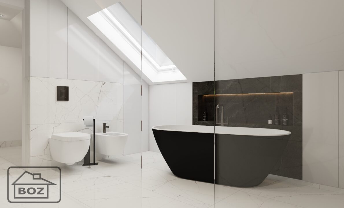 To wnętrze to przykład, jak za pomocą kilku przemyślanych rozwiązań stworzyć czarno białą łazienkę, która łączy w sobie luksus hotelowego spa i funkcjonalność domowego azylu.
