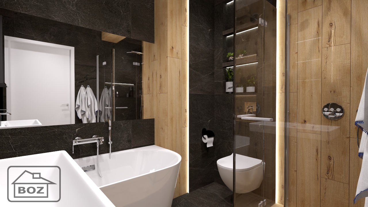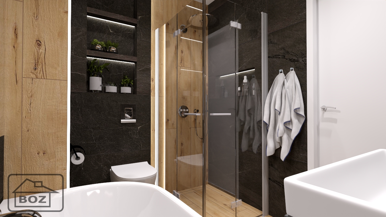 Umiejętne przeplatanie segmentów drewnianych z czarnymi płytkami na ścianie przykuwa wzrok, odwracając go jednocześnie od małej powierzchni całego wnętrza. Taka kompozycja nie jest nudna, wprowadza do środka kontrolowany chaos, dzięki któremu wymiary lazienki schodzą na drugi plan.