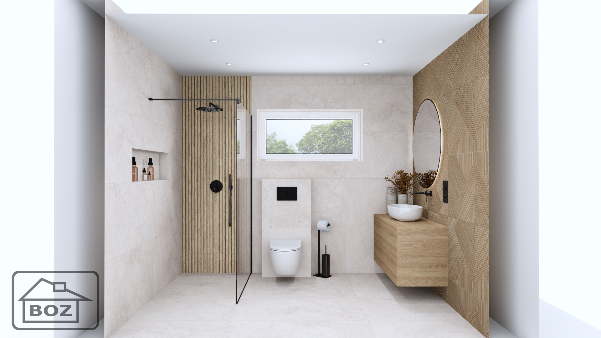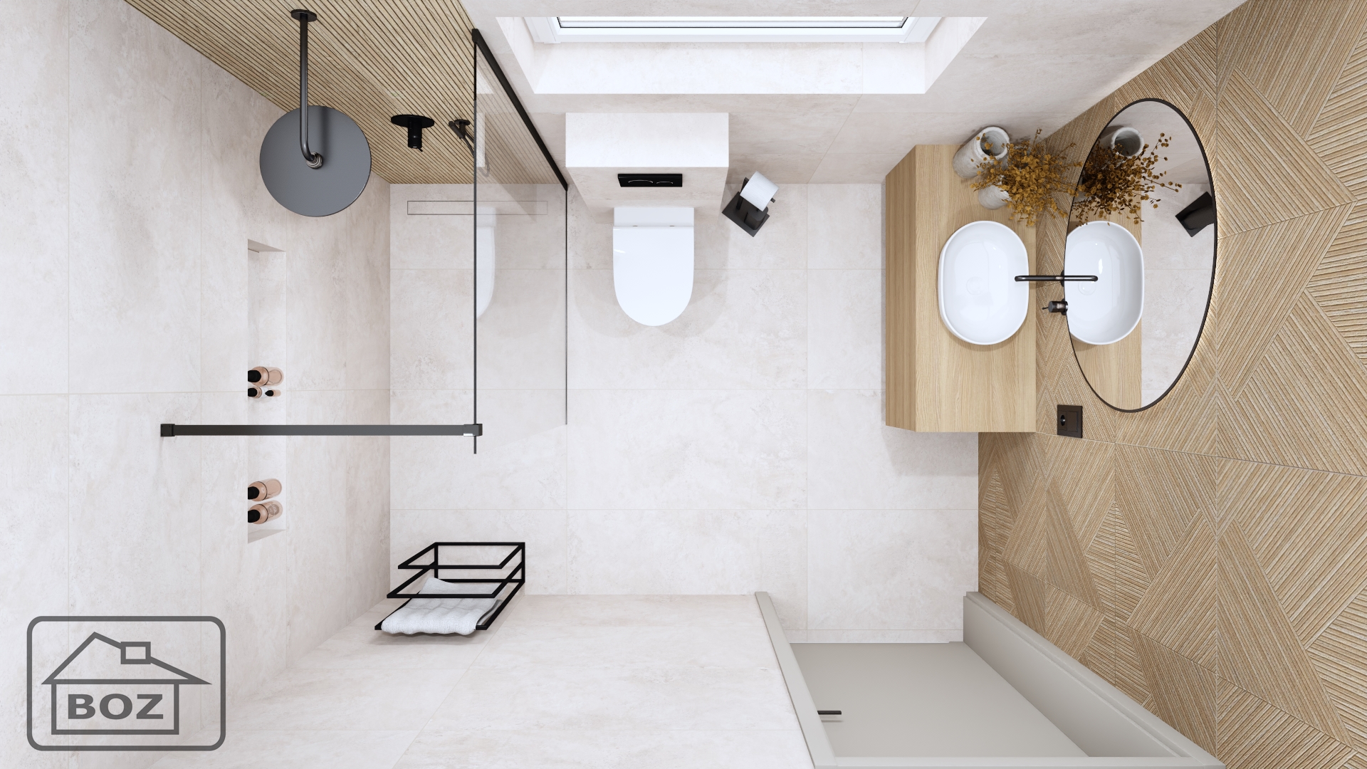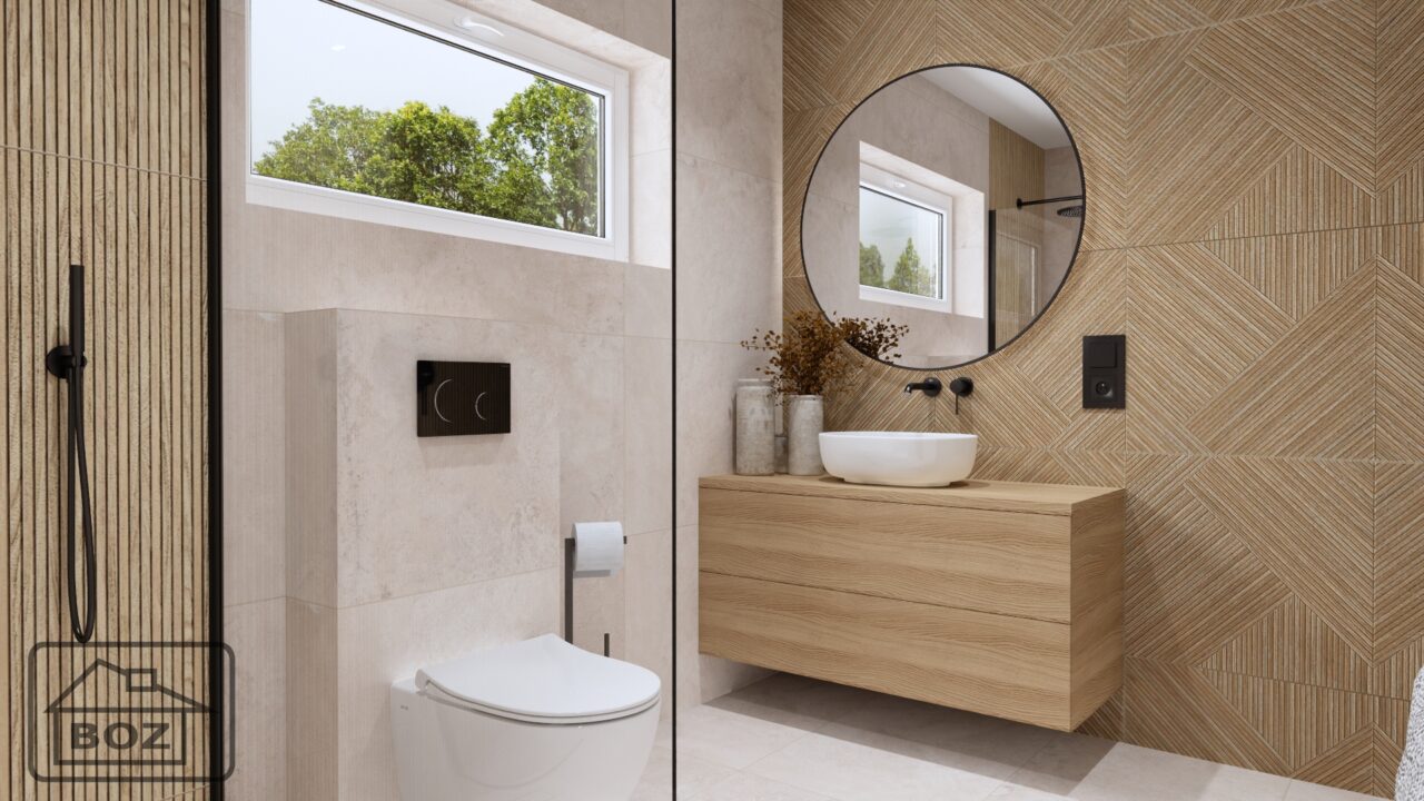 Całość tworzy spójną i nowoczesną przestrzeń, która łączy w sobie funkcjonalność z estetyką. Połączenie kolorów beżu i drewna, drewnopodobne płytki o geometrycznych wzorach oraz ciemne dodatki i podświetlane lustro sprawiają, że łazienka staje się miejscem, w którym nowoczesna stylistyka spotyka się z komfortem codziennego użytkowania.