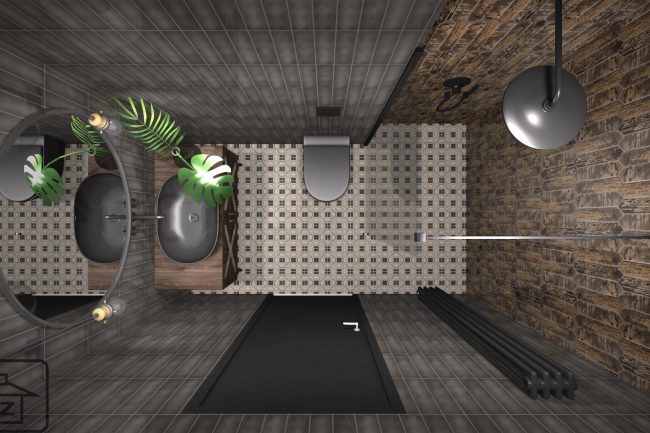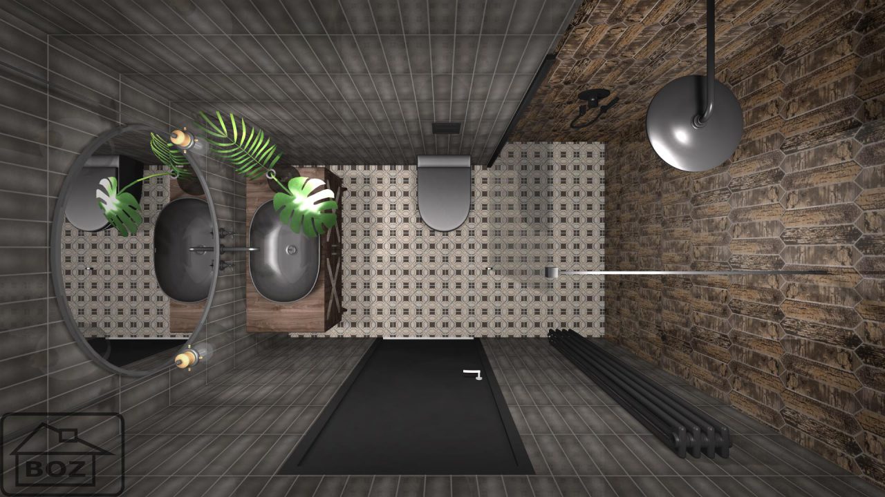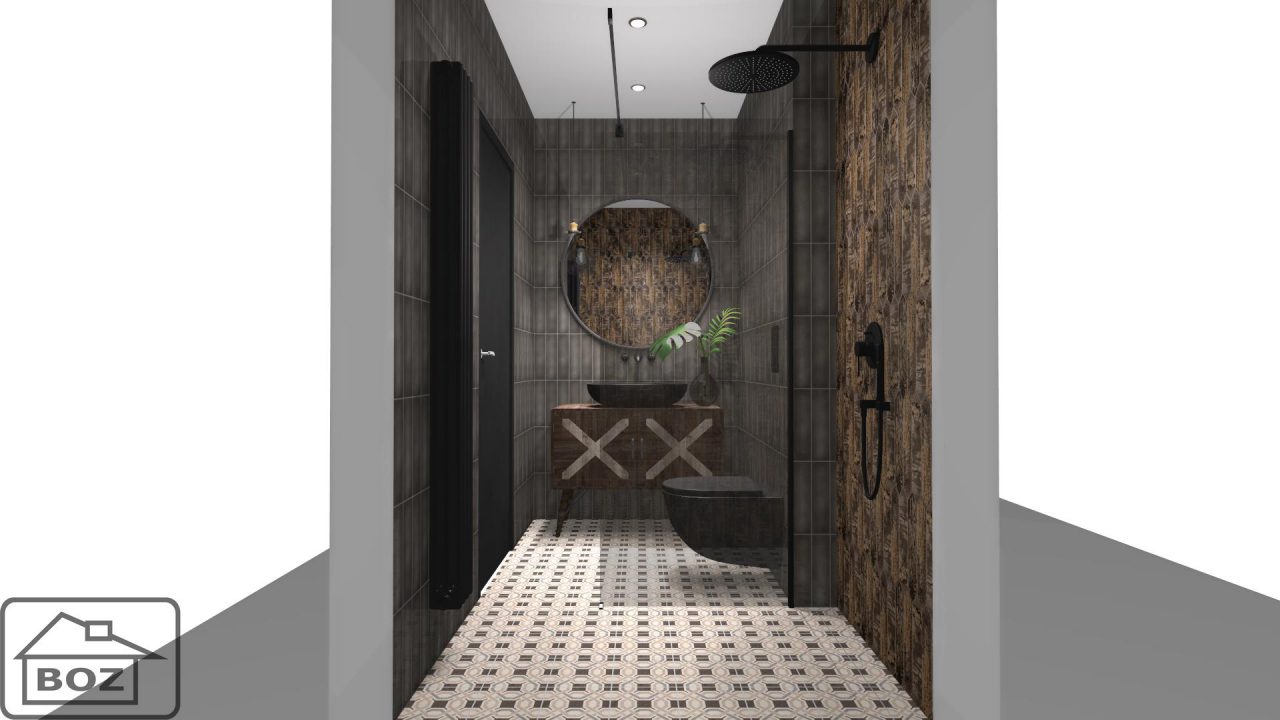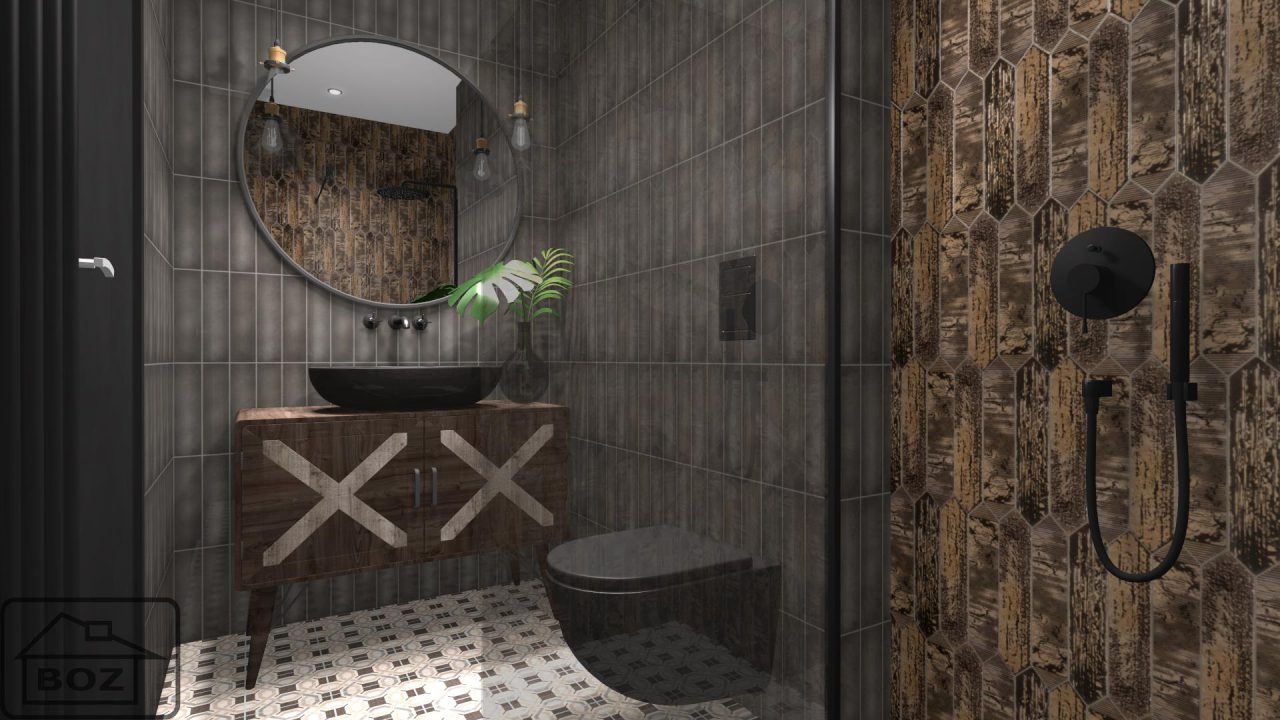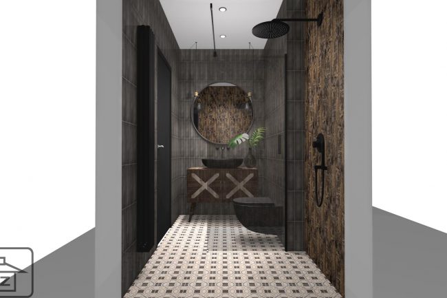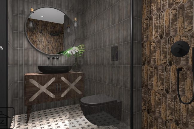 Funkcjonalność wnętrza gwarantuje widoczne wydzielenie strefy prysznicowej, dzięki miedzianym kaflom o charakterystycznym kształcie. Zadbaliśmy o szczegóły, wybierając czarną armaturę, która dopełnia całość: WC – Vitra Sento BLACK, umywalka nablatowa – ZOYA Floran New, ścianka prysznicowa – Kermi Dark Edition.