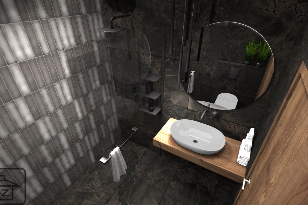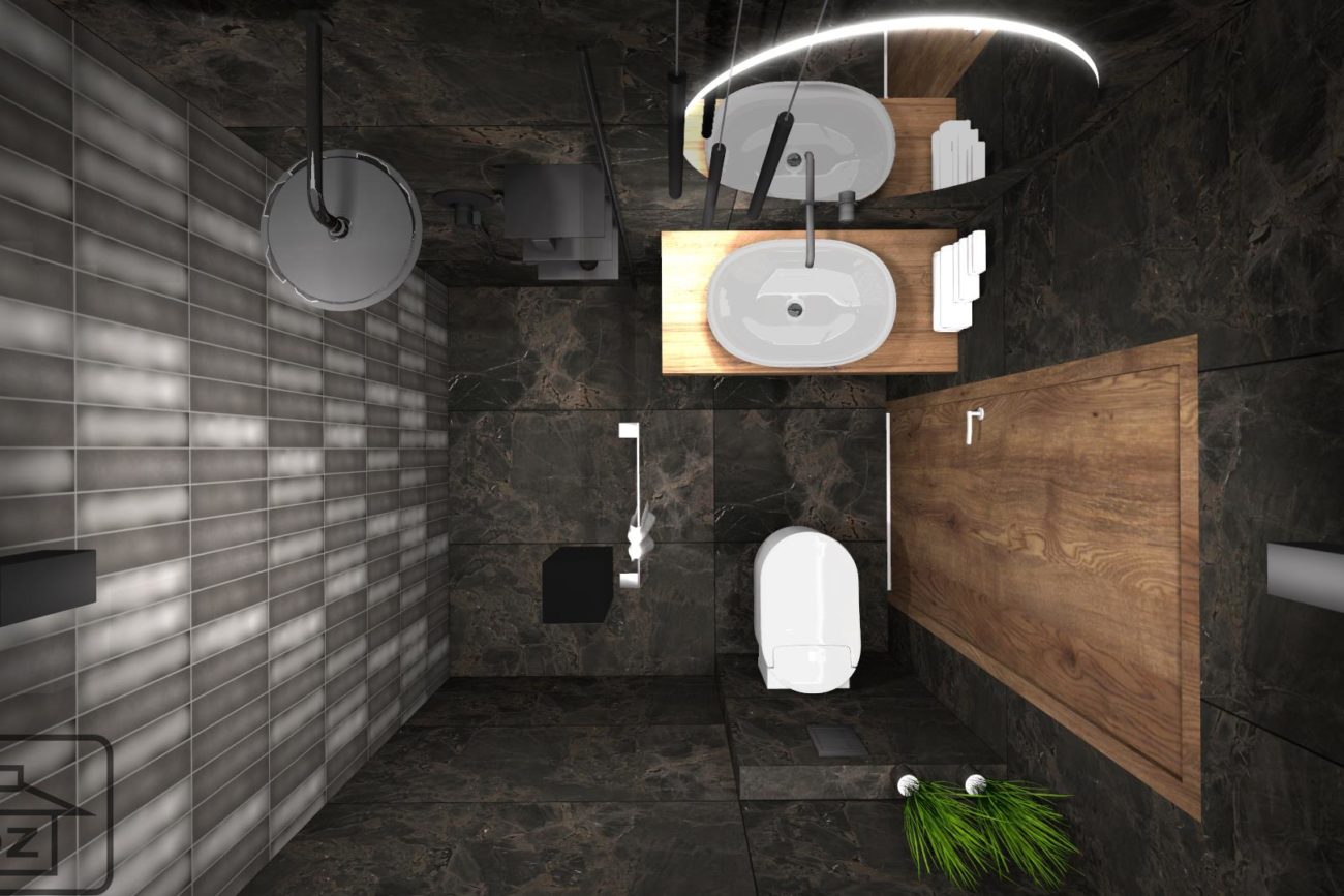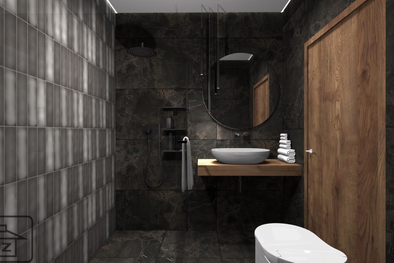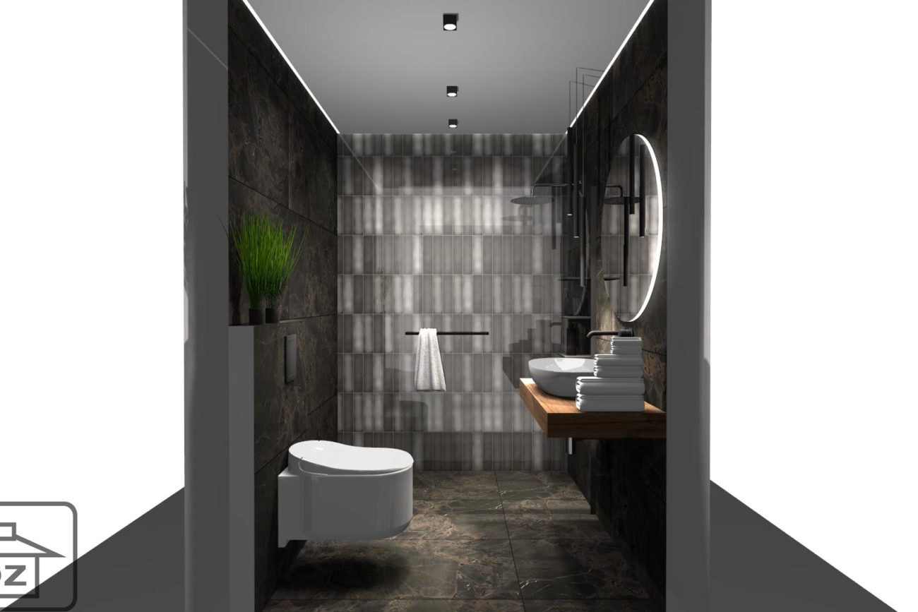 Piękno tkwi w szczegółach, dlatego, podczas wyboru armatury zwróć uwagę, żeby była dopasowana kolorystycznie do płytek – w poniższej wizualizacji wykorzystano baterie Essence Hard Graphite od Grohe. Całość ociepl elementami drewna. Podświetlane, okrągłe lustro sprawi, że wnętrze będzie nawiązywało do najnowszych trendów.