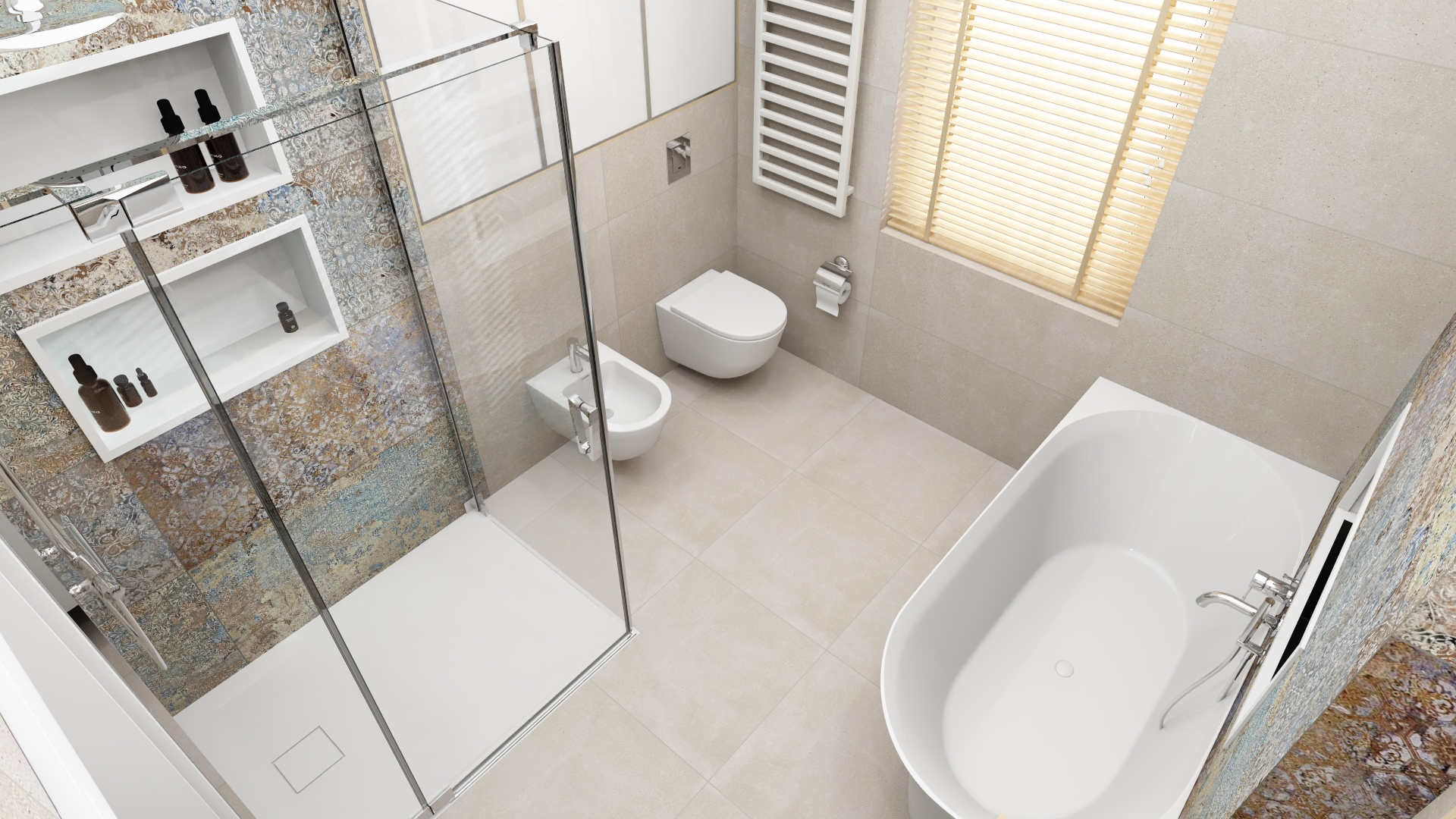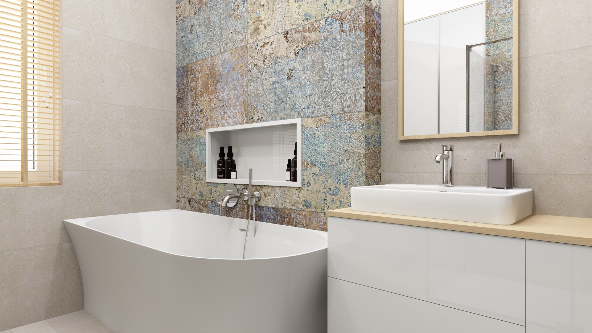 Wprowadź do swojej przestrzeni łazienkowej odrobinę hiszpańskiego uroku. Inspirujące wnętrze stworzone zostało ze stonowanych beży przełamanych wzorzystymi płytkami w niebieskim odcieniu. To połączenie nadaje łazience charakteru i oryginalności. Dodając płytki o zróżnicowanym wzorze wprowadzamy do pomieszczenia dynamikę i ciepło.