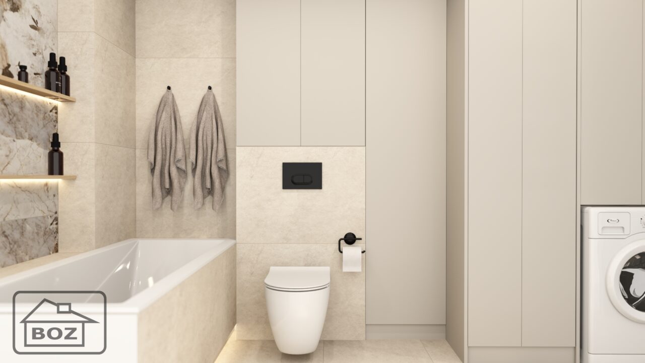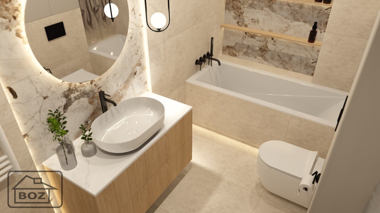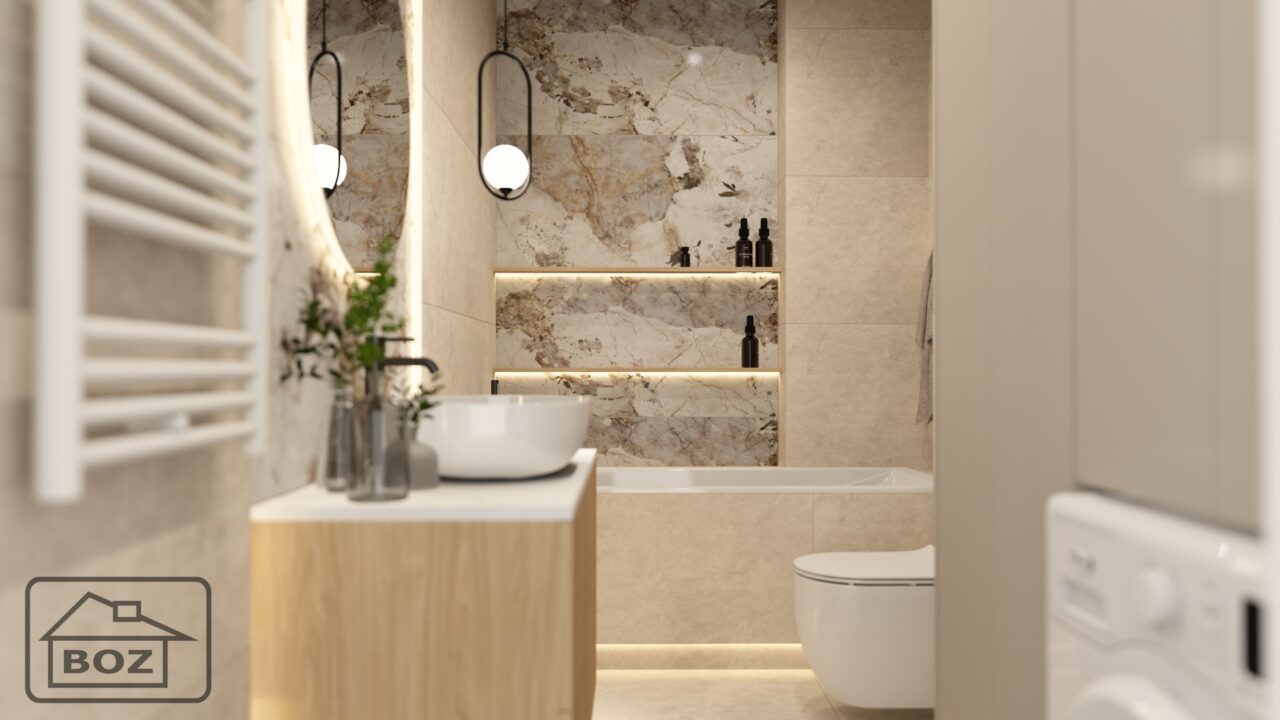 Połączenie imitacji Patagonii z drewnianymi akcentami, przemyślana zabudowa meblowa i subtelne oświetlenie LED – to przepis na łazienkę, która będzie Cię zachwycać przez lata. To przestrzeń, w której surowa elegancja spotyka się z funkcjonalnością, a naturalne inspiracje z nowoczesną technologią.