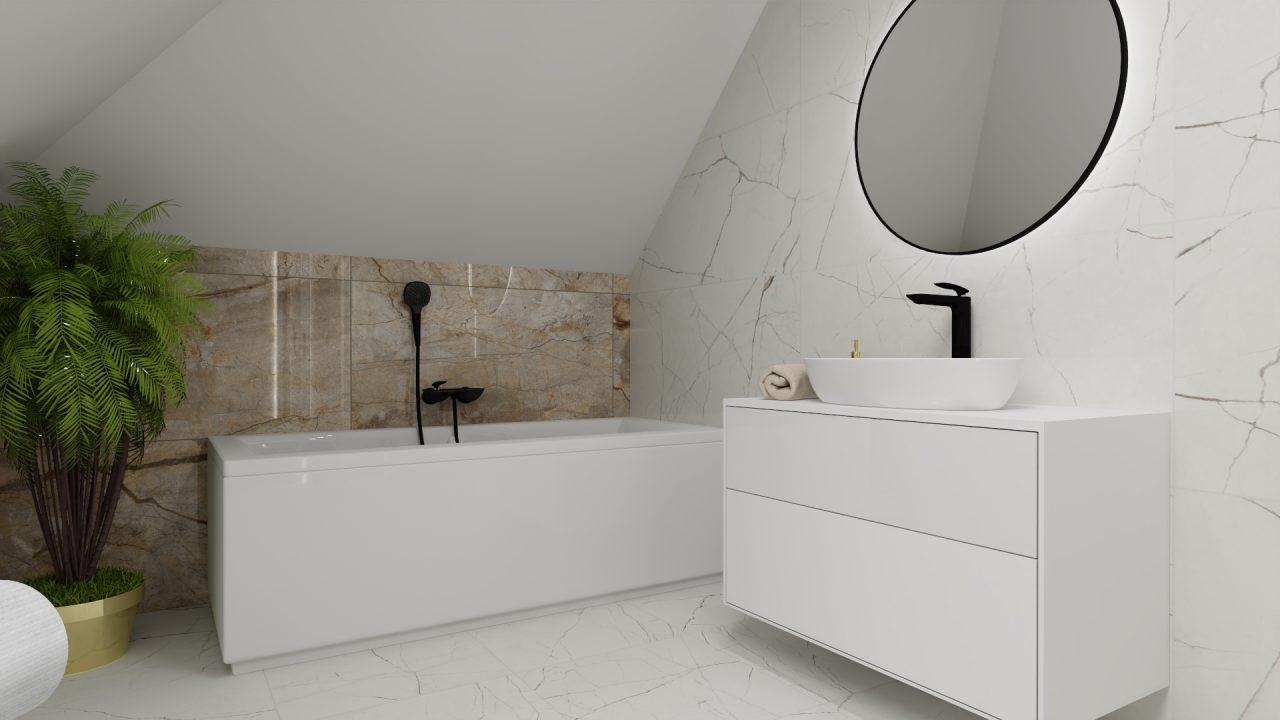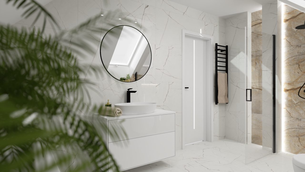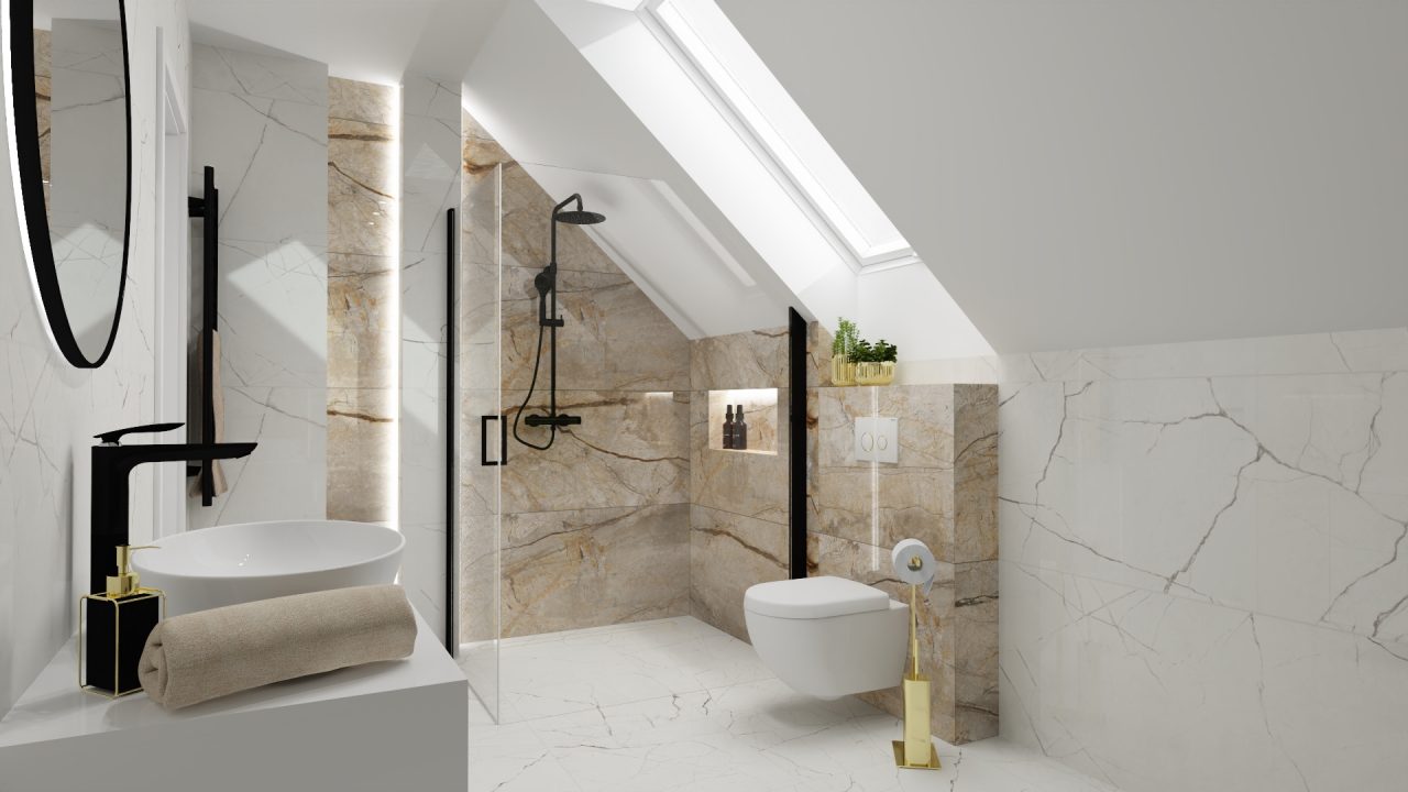 Płytki imitujące kamień w łazience na poddaszu to wybór, który łączy w sobie naturę i nowoczesność. Płytki w połysku powiększają przestrzeń, a różne odcienie kamienia tworzą intrygujący kontrast i dodają całemu wnętrzu głębokiego charakteru. Biała szafka pod umywalką idealnie dopełnia przestrzeń, a czarne baterie i okrągłe lustro to akcenty, które podkreślają oryginalność wnętrza. Ta aranżacja niewątpliwie łączy w sobie funkcjonalność z ponadczasową elegancją, tworząc wnętrze, które zachwyci każdego.