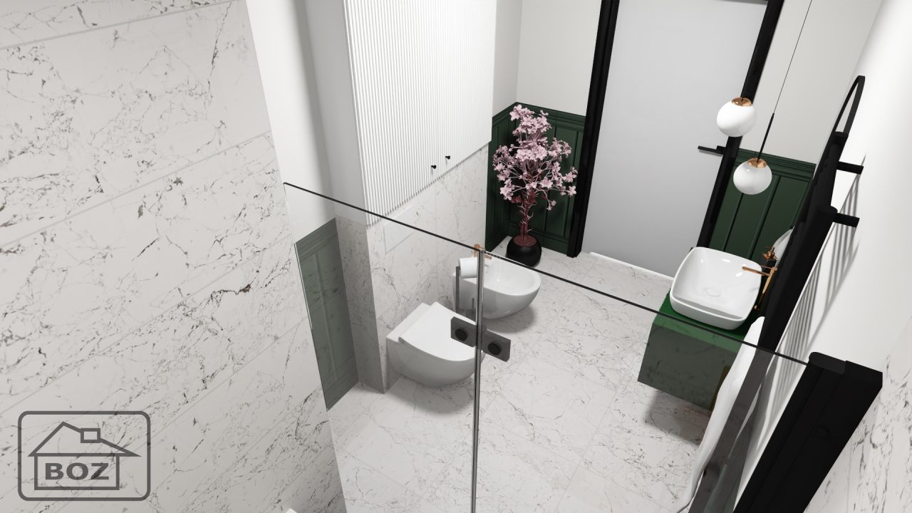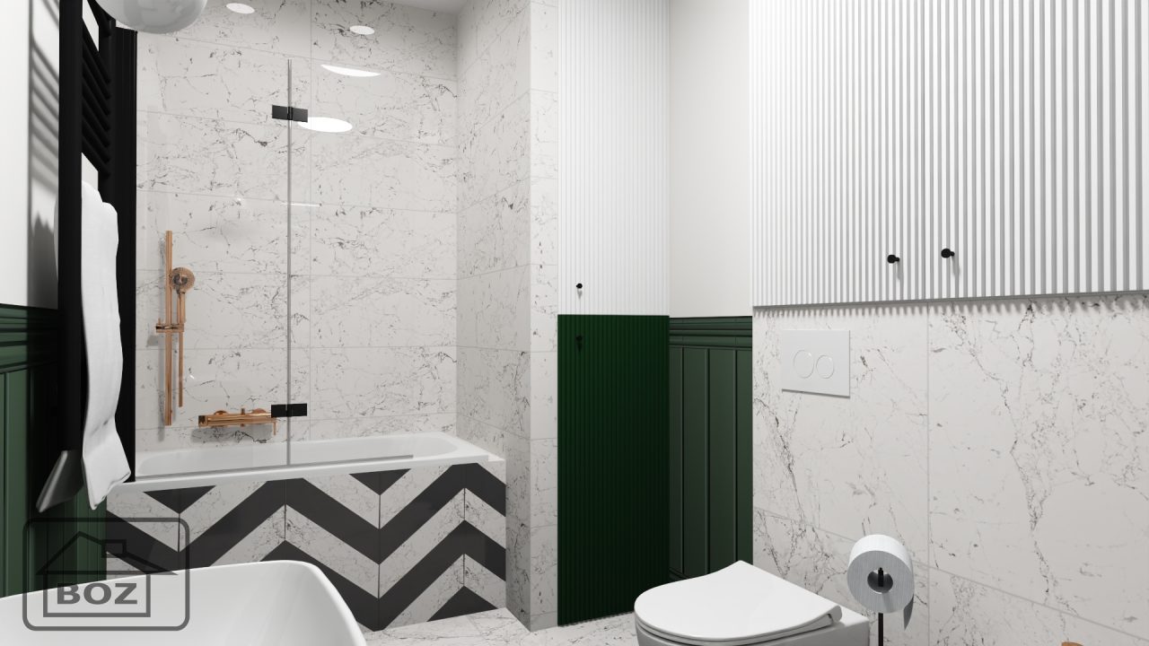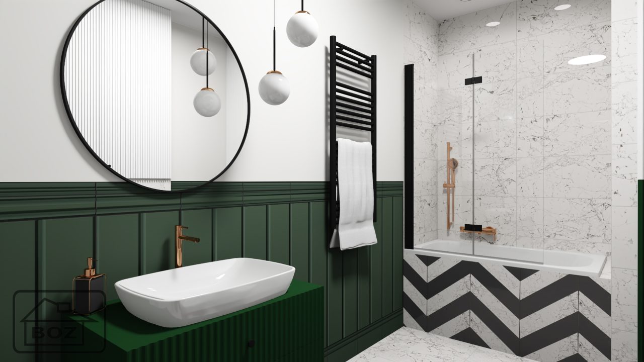 Klasyczne kolory to niezmiennie modne rozwiązanie, które niewątpliwie kojarzy się z angielskim stylem. Biel, szarość i czerń to kolory, które tworzyć będą bazę naszej aranżacji. Przełamanie ich zieloną płytką imitującą lamperię to subtelny akcent, który nada łazience wyjątkowego charakteru. To nawiązanie do klasycznego wzornictwa i subtelne przywołanie atmosfery angielskich rezydencji.