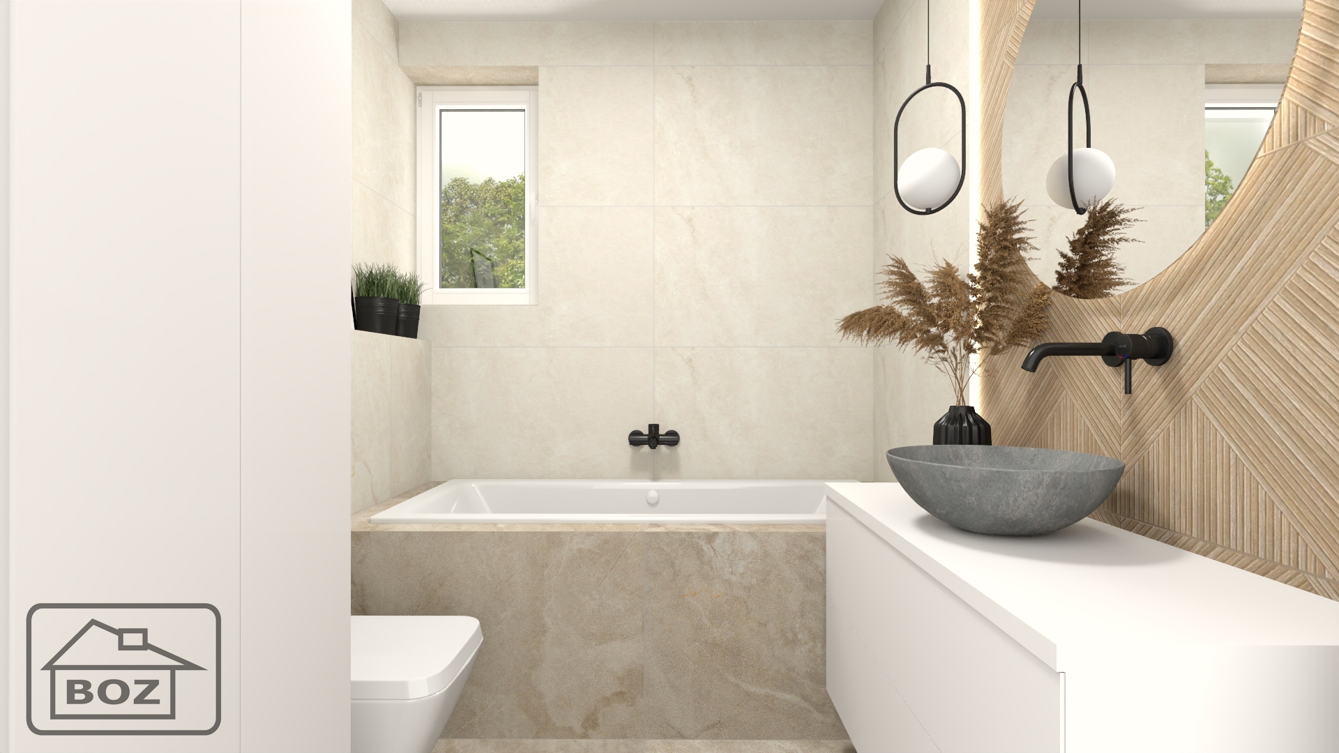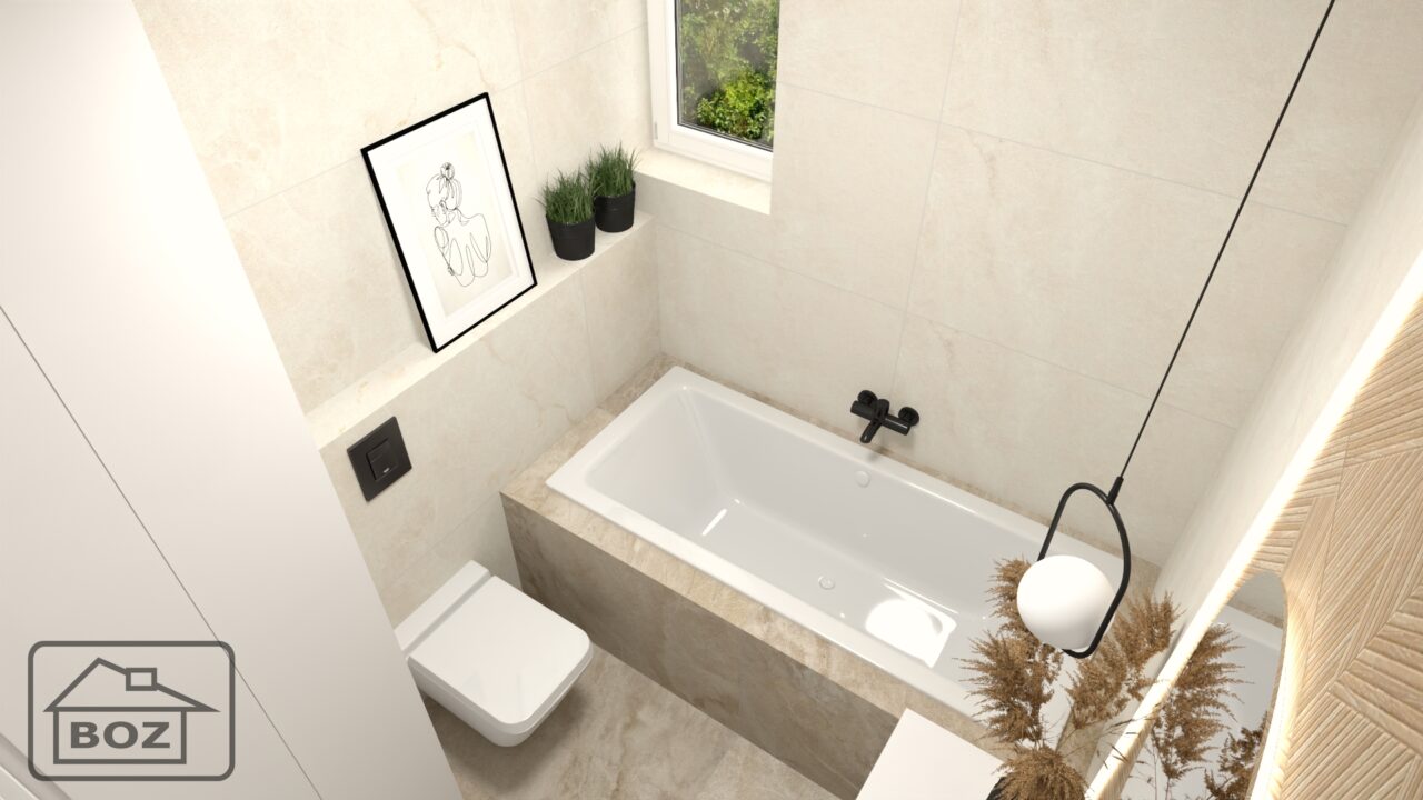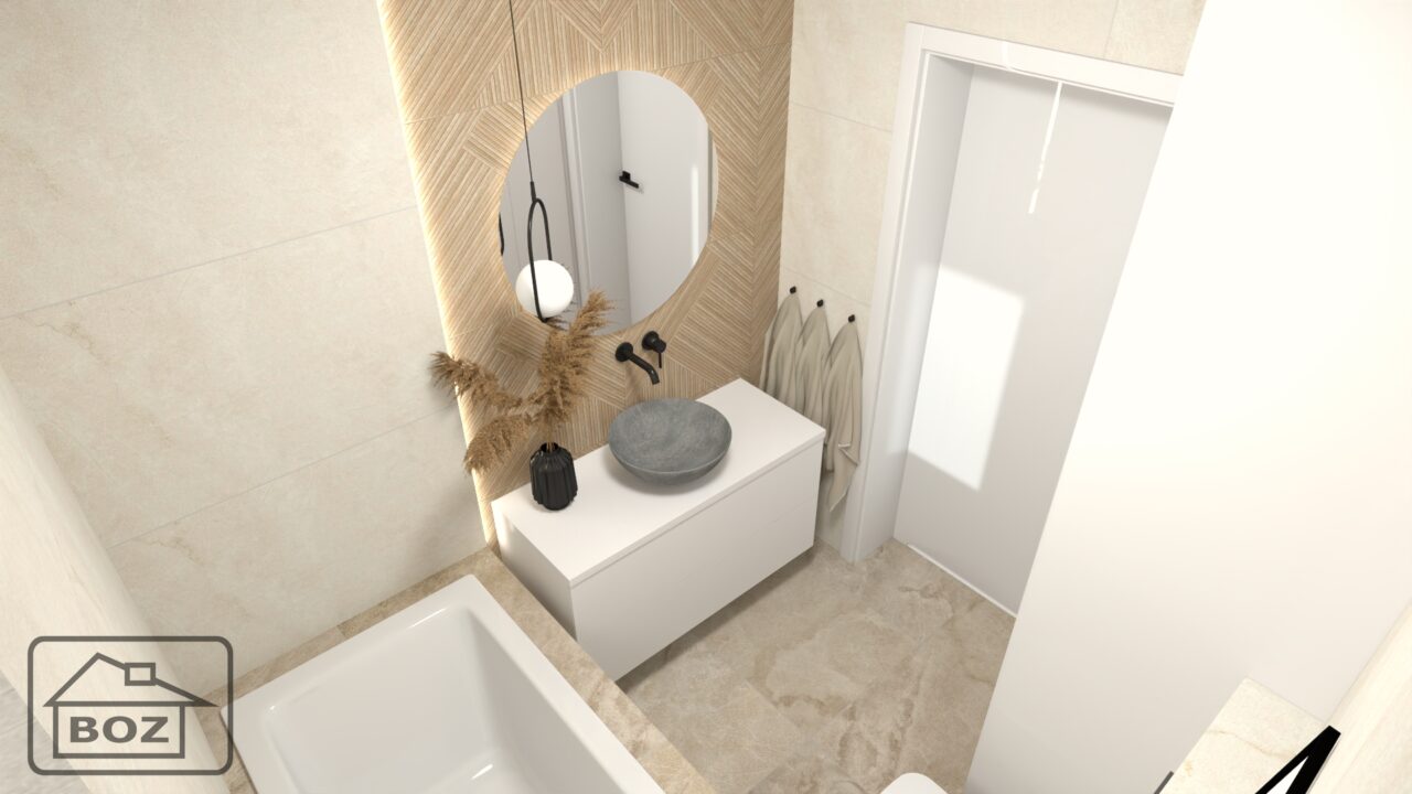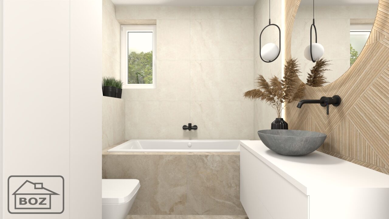 Ciepła łazienka, z beżową kolorystyką płytek imitujących delikatny kamień, drewnopodobnym akcentem za lustrem podkreślonym oświetleniem LED oraz ciemnymi akcentami, tworzy harmonijną i przytulną przestrzeń. Taka aranżacja łączy w sobie naturalne materiały z nowoczesnymi detalami, co sprawia, że wnętrze jest zarówno funkcjonalne, jak i estetycznie wyrafinowane.
