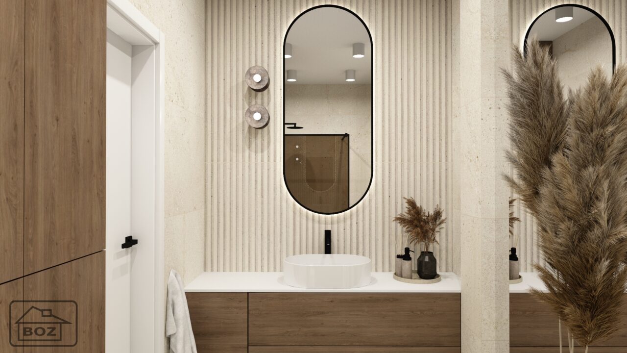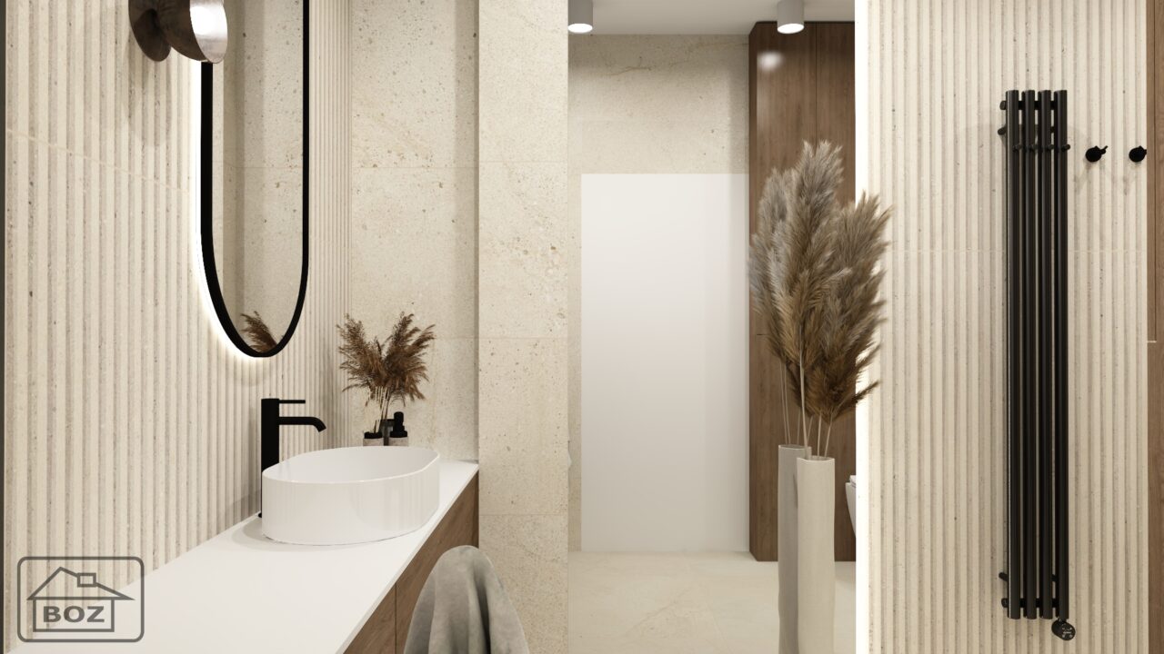Ta aranżacja to połączenie naturalnych barw, eleganckich wykończeń i funkcjonalnych rozwiązań. Łazienka inspirowana naturą w stylu beżowego, piaskowego spokoju nie tylko cieszy oko, ale też staje się codziennym azylem, w którym można doświadczyć prawdziwego relaksu. Zestawienie delikatnych struktur, ciemnego drewna, złamanych beży i nowoczesnych dodatków to przepis na wnętrze, które pozostanie stylowe na lata.