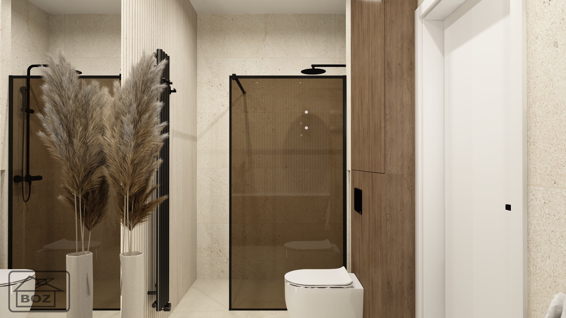 Nie można pominąć detalu, który dopełnia całości – szyby prysznicowej w kolorze brązu. Nietuzinkowy wybór ale na pewno wyróżnia się na tle standardowych rozwiązań. Brązowe profile nadają strefie prysznica miękkości i idealnie wpisują się w koncepcję ciepłego, naturalnego wnętrza.