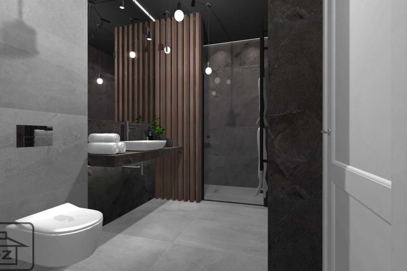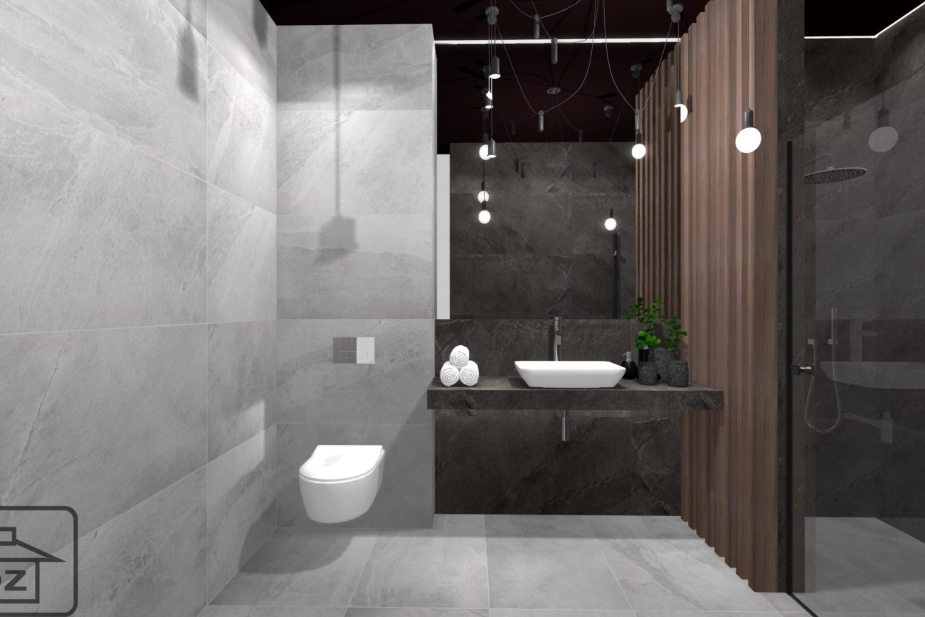 Do tej aranżacji wybraliśmy imitację kamienia naturalnego – płytki X-Rock od Imola. Dobraliśmy do nich, ocieplające wnętrze, elementy drewna. Uwagę w tej łazience będzie przyciągało oświetlenie – nowoczesne lampy w stylu loft.