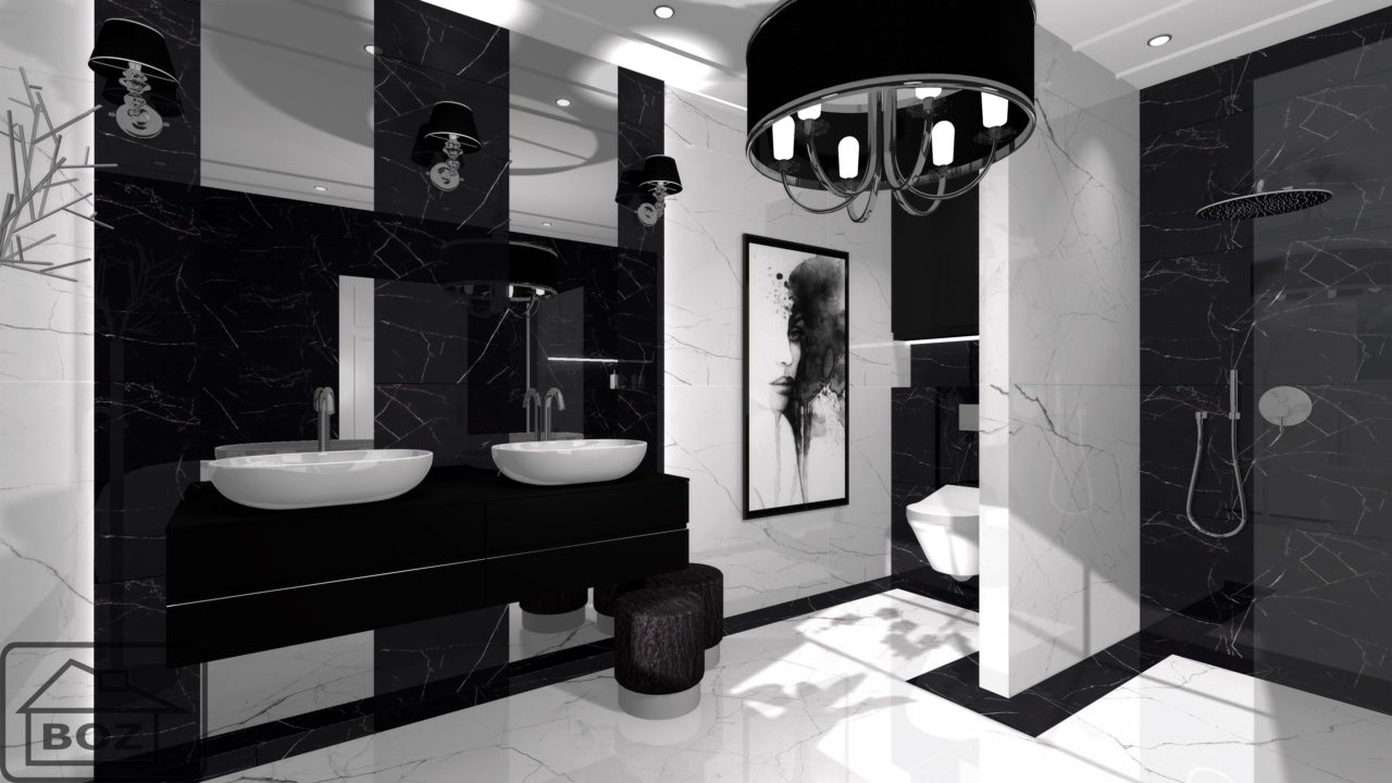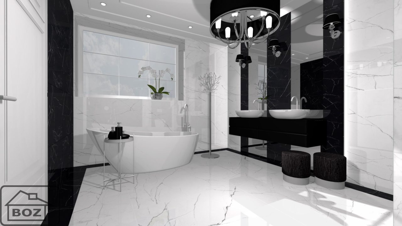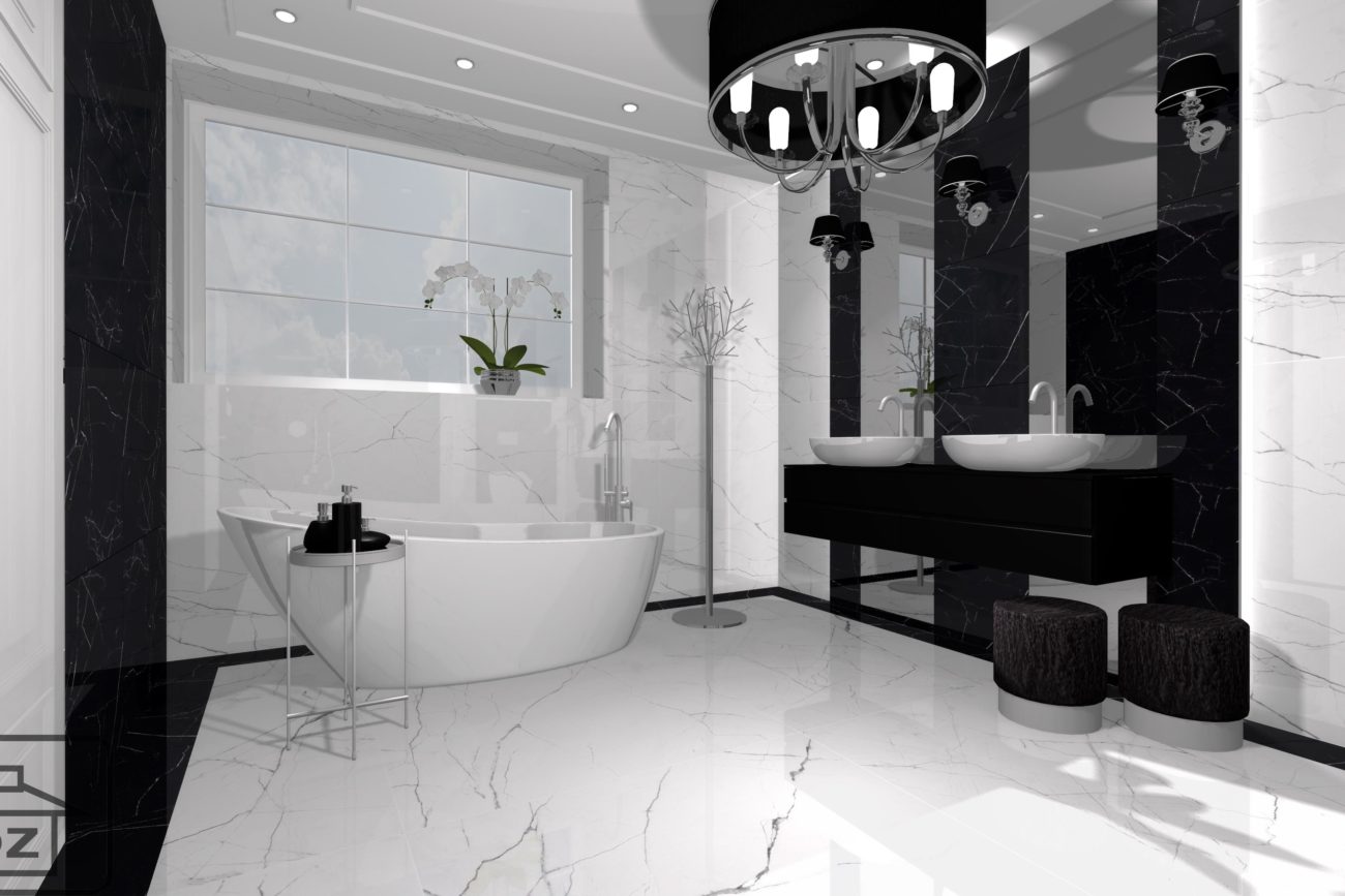 Na jakie elementy tej propozycji warto zwrócić uwagę? Charakteru temu wnętrzu nadaje połączenie płytek. Wybraliśmy, imitujące marmur, płytki Imola The Room STA od Imola oraz Royal Nero Collection Majestic od Ceramiche Piemme. To harmonijne zestawienie czerni i bieli sprawia, że wnętrze staje się niezwykle szykowne.