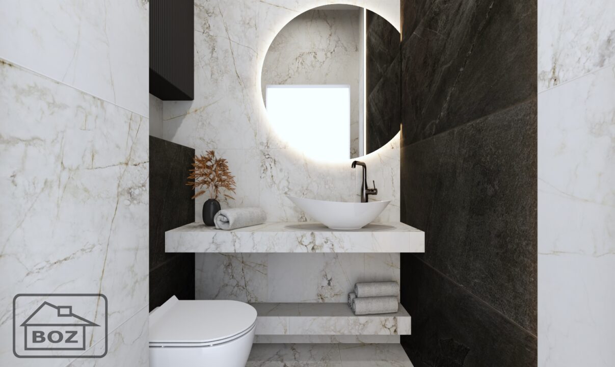 Ważnym elementem wystroju są ciemne akcenty, które podkreślają nowoczesny charakter pomieszczenia. Mogą to być baterie, profile meblowe, ramy luster czy elementy dekoracyjne. Kontrastując z jaśniejszymi powierzchniami, wprowadzają do łazienki głębię i wyrazistość, jednocześnie zachowując minimalistyczną harmonię aranżacji.