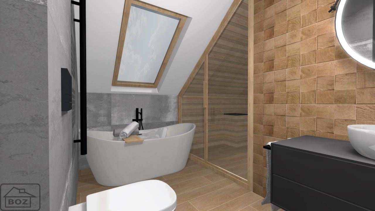 W pomieszczeniu wydzielono specjalne miejsce na saunę, której wnętrze w całości powstało z cedrowego drewna. Aby połączyć drewniany klimat z pozostałą częścią łazienki sięgnęliśmy po połączenie drewnopodobnych płytek z betonowymi.