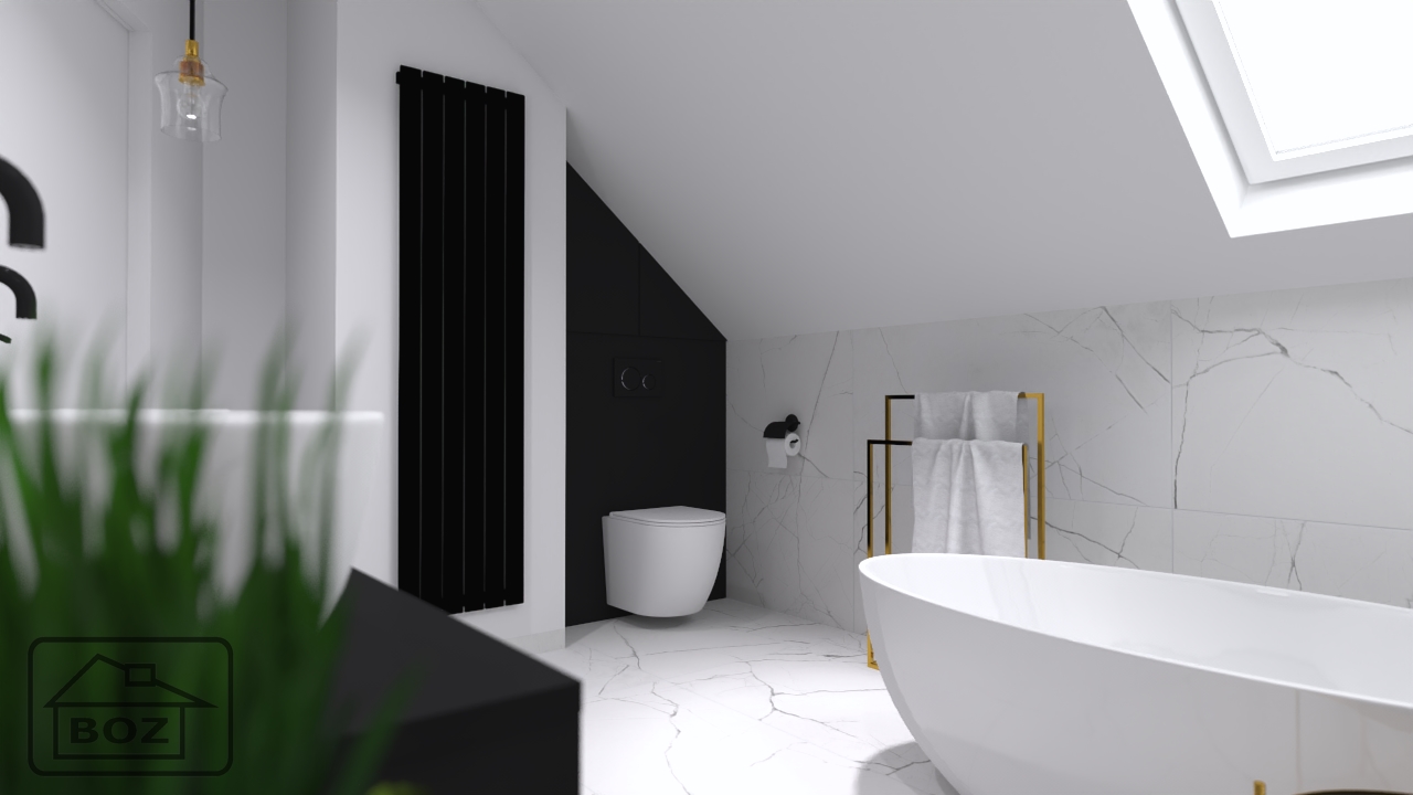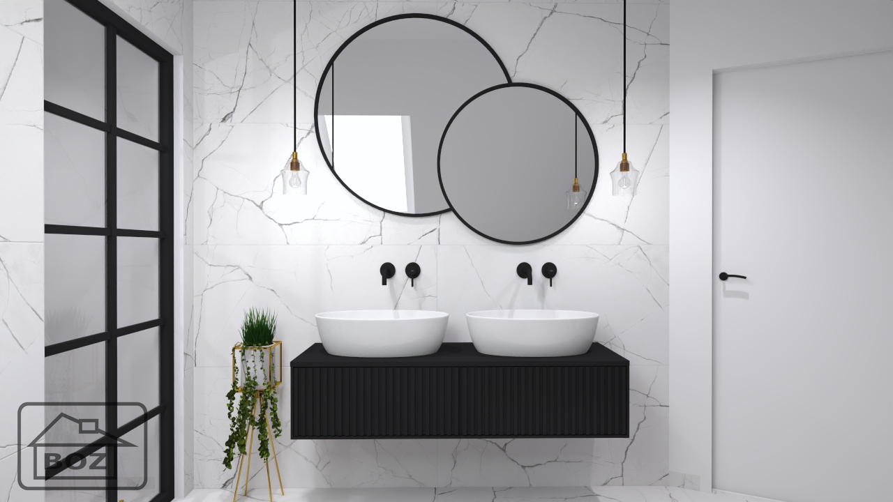 Ponadczasowy wygląd łazienki to zasługa połączenia uniwersalnych kolorów. Biel, która jest bazą do stworzenia całego wnętrza przełamana została strukturą naturalnego żyłkowania płytek. Wielkoformatowe płytki utrzymane w jednej tonacji kolorystycznej optycznie powiększają przestrzeń. By oddzielić strefę relaksu od strefy użytkowej za drzwiami wydzielono miejsce na pralnię.