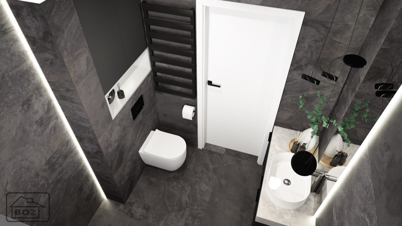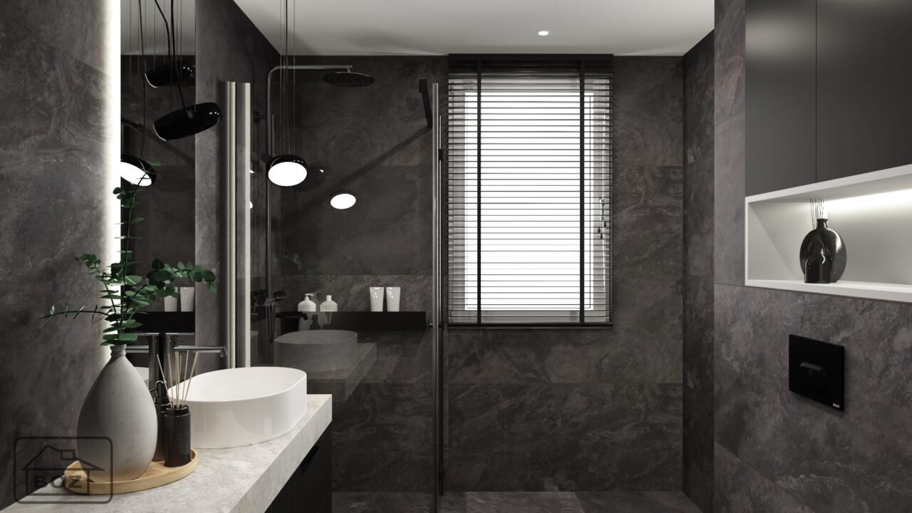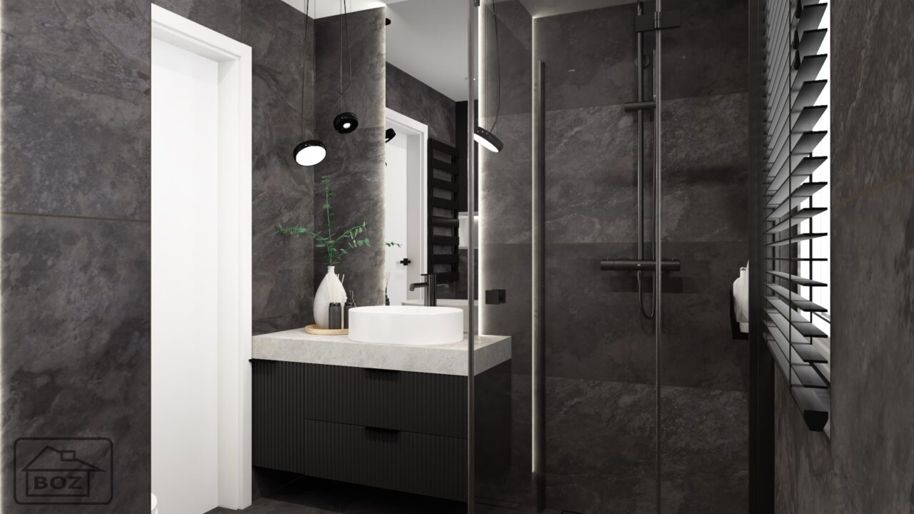 Kluczem do sukcesu przy takiej aranżacji są ciemne akcenty – spójne z kolorem płytek, ale kontrastujące z detalami. Czarne baterie, mebel pod umywalką oraz grzejnik to elementy, które nie tylko podkreślają nowoczesny styl łazienki, ale również idealnie współgrają z kamiennym wzorem. Dzięki temu całość zyskuje elegancki, nieco loftowy charakter, bez zbędnych ozdobników.
