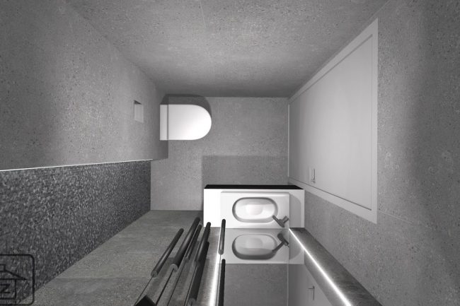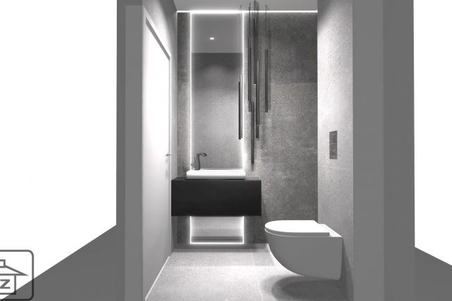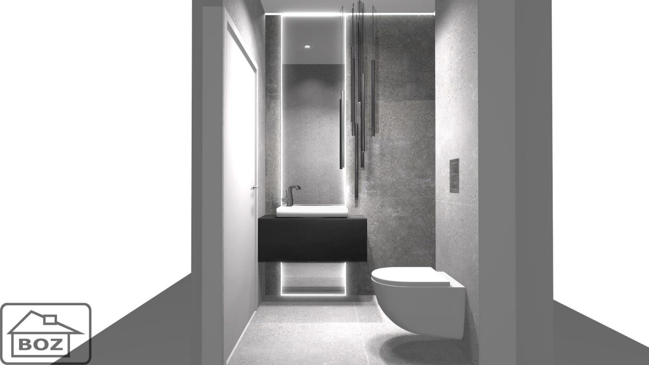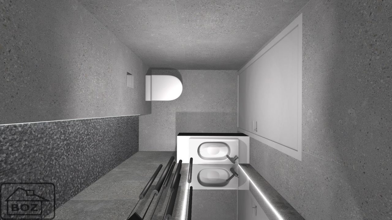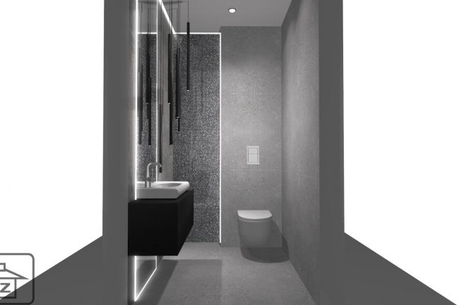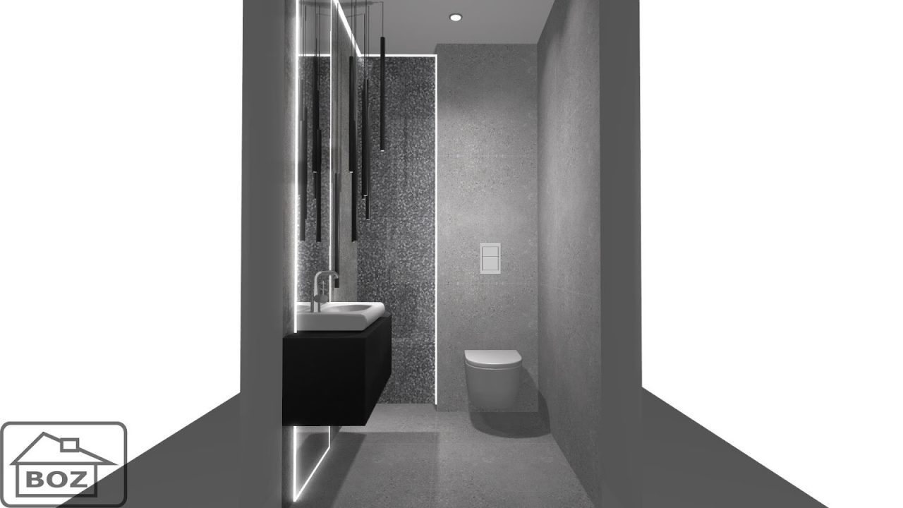 W tej propozycji postawiliśmy na płytki imitujące lastryko z serii Underground od Keraben w kolorze szarym i grafitowym. Ciekawym rozwiązaniem jest zastosowanie podświetlenia na ścianie z mozaiką z serii GRAVITY ALUMINIUM 3D HEXAGON METAL od L’antic colonial, które wydobywa jej kształt oraz pełni funkcję dekoracyjną. Takie połączenie nadaje wnętrzu unikalny charakter i zwiększa wrażenie przestronności.
