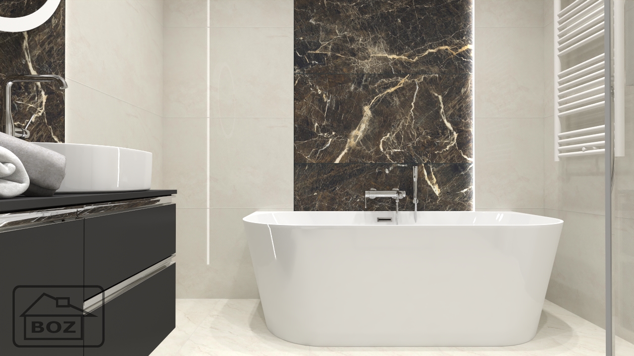 Elegancki i majestatyczny charakter łazienki podkreślono dodatkami. Przy ścianie znajduje się biała wanna wolnostojąca, dzięki której każda kąpiel będzie prawdziwym relaksem. Pozostałe sprzęty łazienkowe także są w białym kolorze, podtrzymują tym samym harmonię pomieszczenia i dodają świeżości.