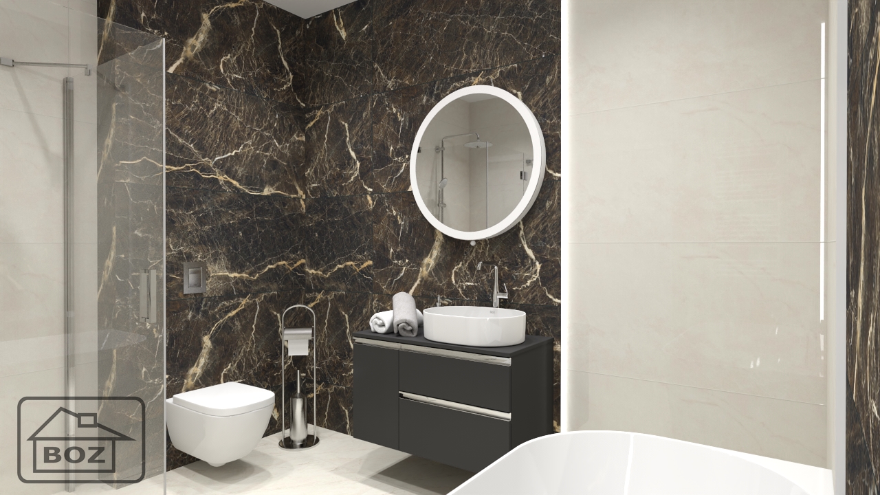Pierwsze skrzypce w tej aranżacji gra marmur – ciemne tło przecinane gęsto usianymi żyłkami w odcieniu złamanej bieli przypomina wulkaniczne skały. Ten szlachetny materiał zdobi fragmenty ścian w łazience. Połączony z kremową bielą odbija i rozprasza światło. Każda z tych powierzchni została dodatkowo oddzielona taśmami led.