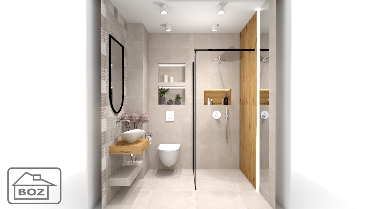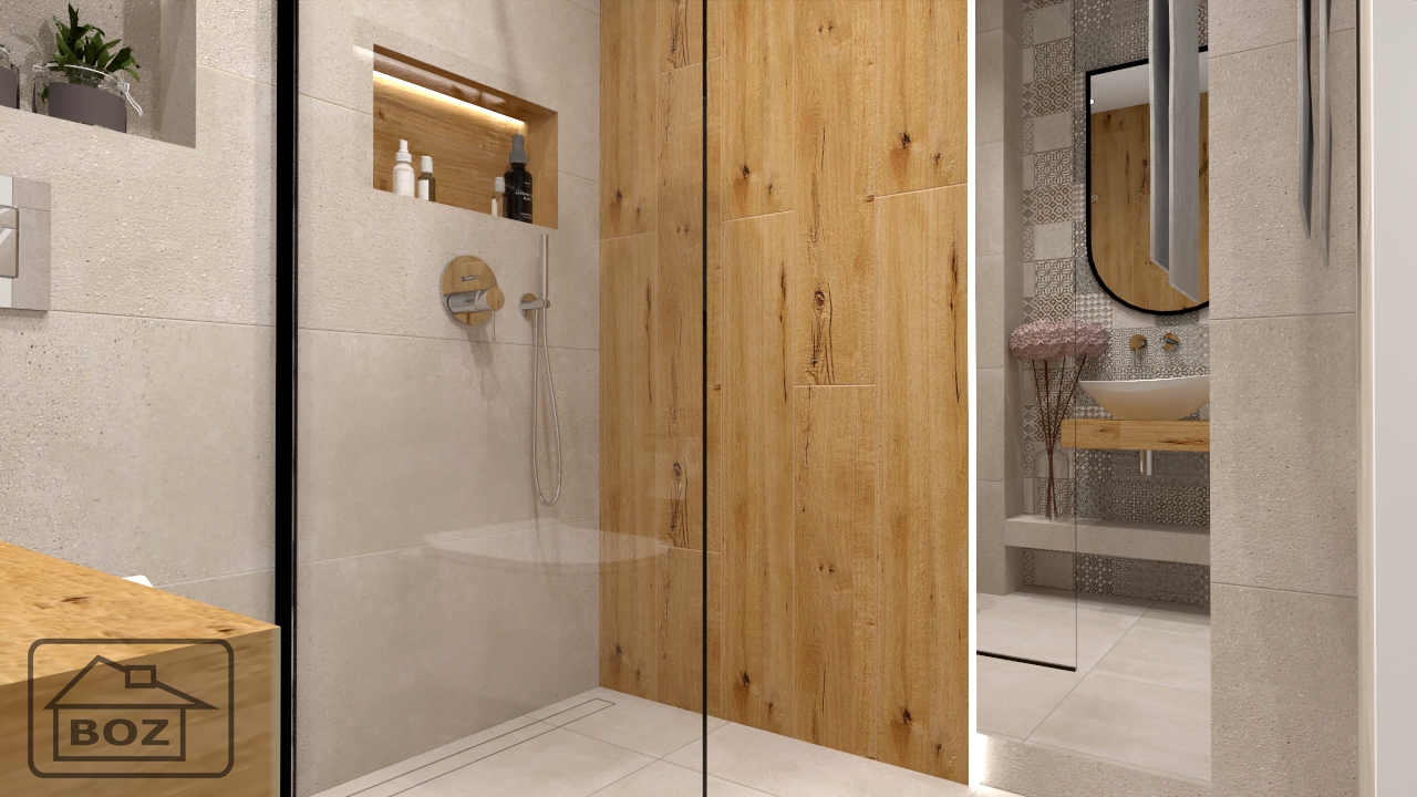Aranżując łazienkę inspirowaną naturą warto pamiętać o drewnianych elementach – nie tylko pięknie wyglądają, ale też ocieplają wnętrze. Drewnopodobne płytki to sprytne rozwiązanie, dzięki któremu możemy cieszyć się wyglądem drewna i wytrzymałością płytek gresowych. Ten drewniany akcent pojawił się na ściance prysznicowej, we wnęce półki prysznicowej oraz jako blat pod umywalkę. Uwagę przykuwa też lustro o oryginalnym kształcie.