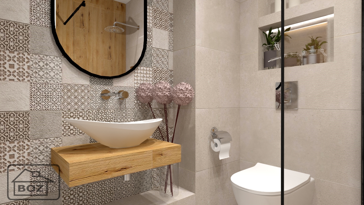Beżowe płytki, które zdominowały wnętrze łazienki połączyliśmy z elementem dekoracyjnym – patchworkowymi płytkami w tym samym odcieniu co bazowe. Zastosowanie takiego zabiegu wzmacnia efekt przytulnego i relaksującego miejsca, prawdziwego salonu spa.