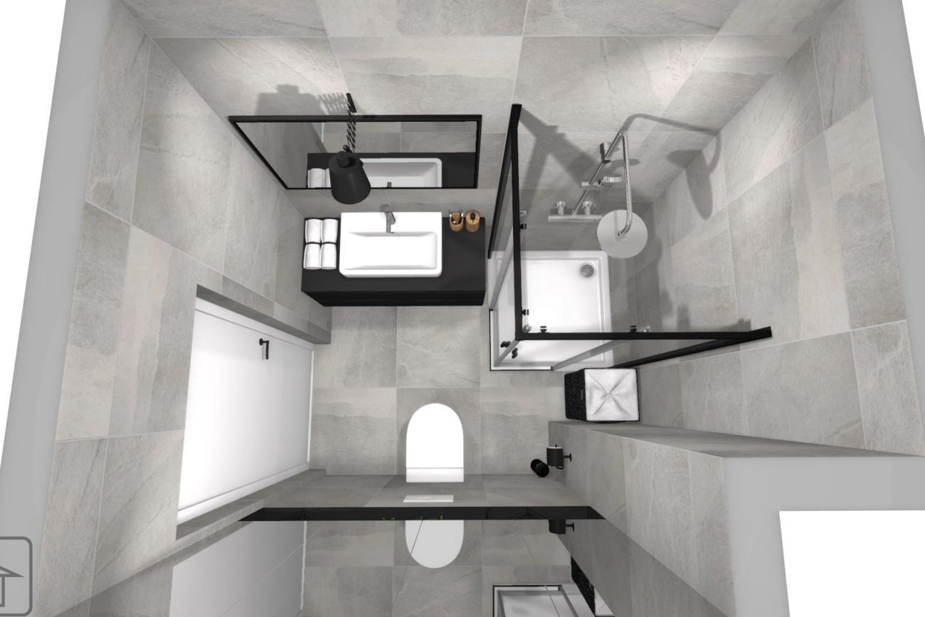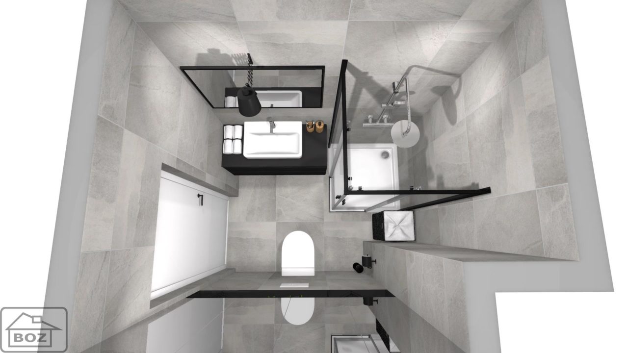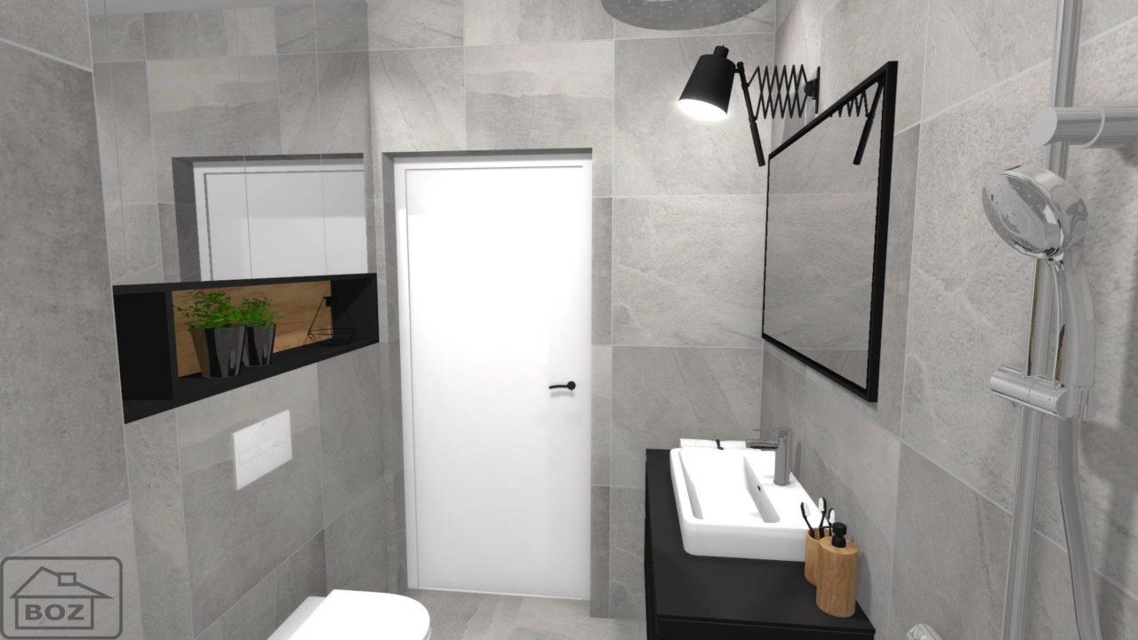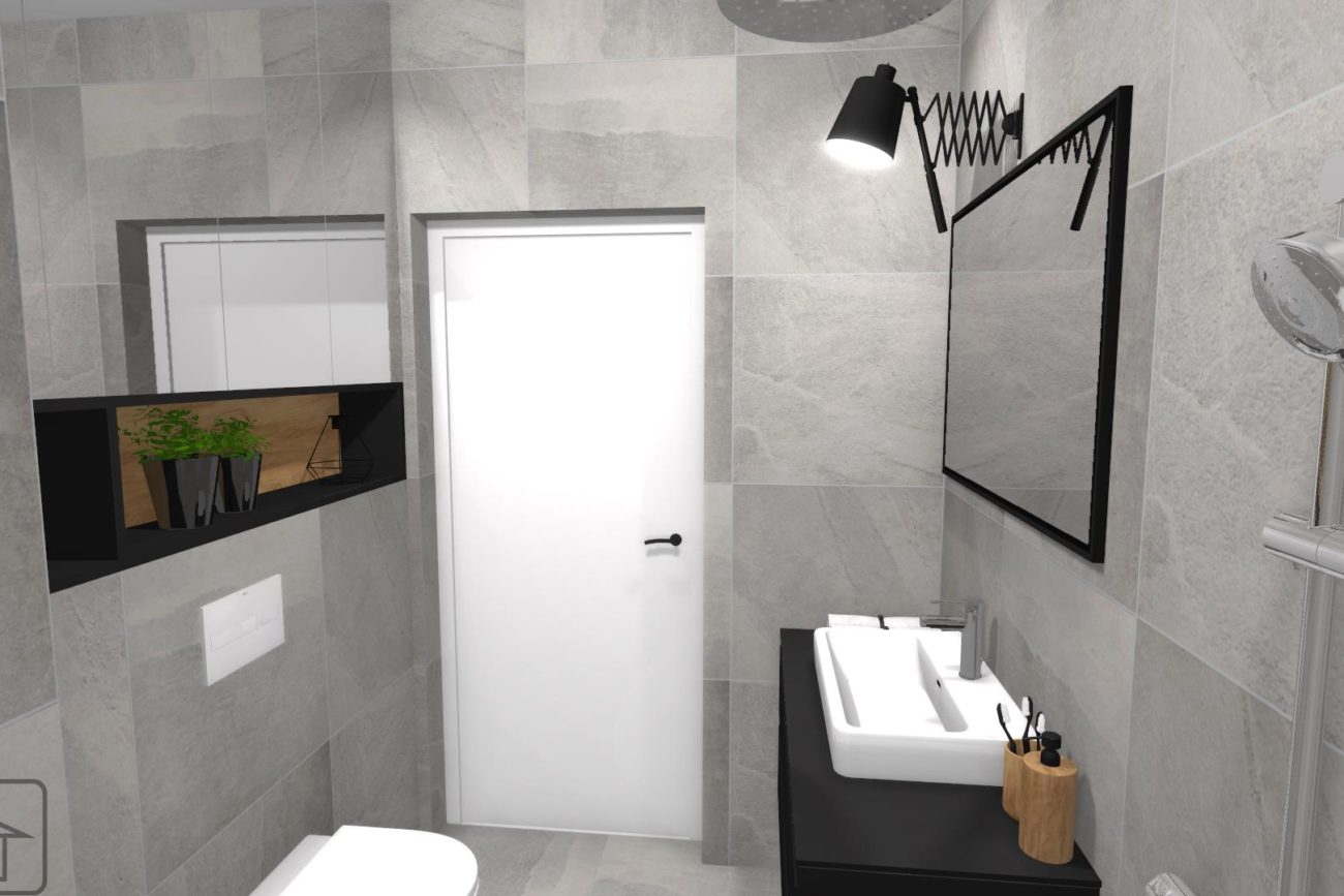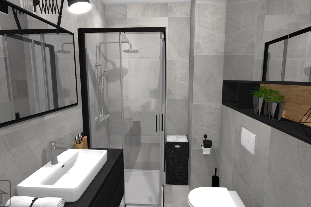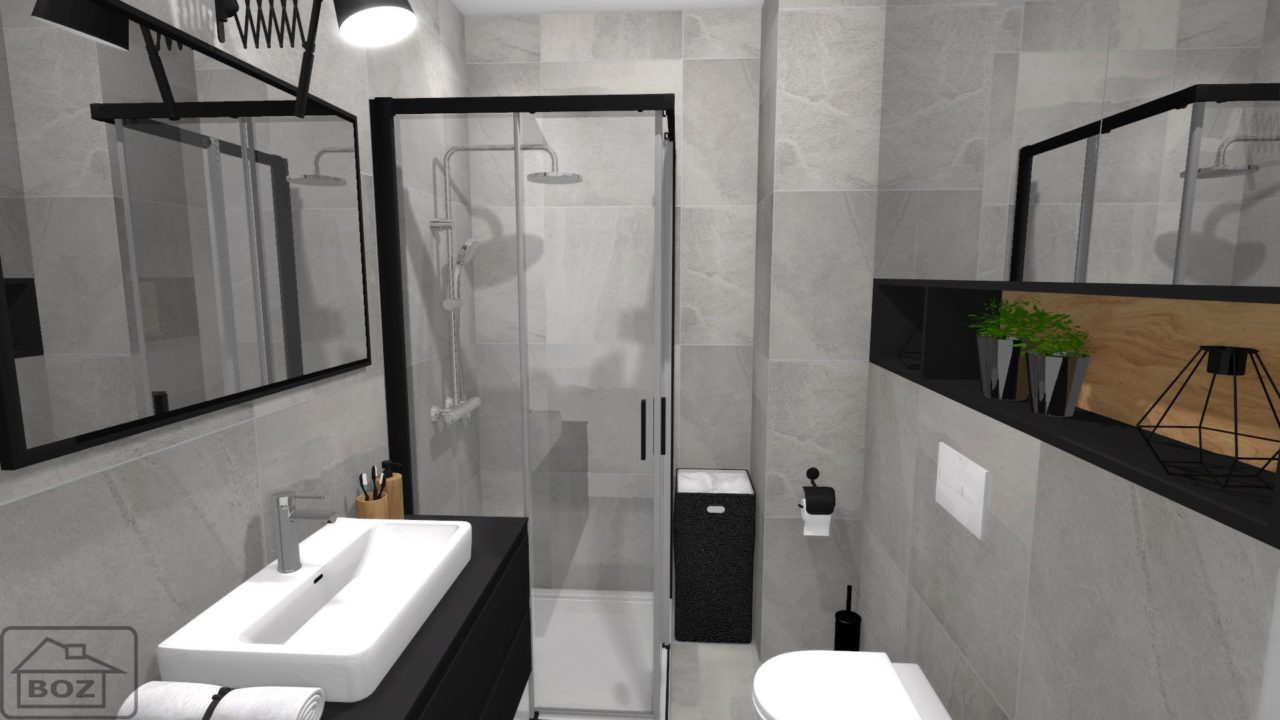 O prostocie tego wnętrza decydują minimalistyczne, lecz gustowne dodatki. To dzięki nim łazienka nabiera charakteru. Postawiliśmy na elegancką czerń, stanowiącą kontrast do jasnego odcienia płytek i ścian. Oprócz czarnej szafki pod umywalką, ramy lustra czy drobnych łazienkowych akcesoriów, postawiliśmy na czarną ramę kabiny prysznicowej, co wpisuje się w najnowsze trendy wnętrzarskie. Zależy Ci na poszerzeniu wąskiej łazienki? Na wzór naszej wizualizacji, wybierz lustro nad umywalką, a naprzeciwko niej umieść dużą szafkę lustrzaną nad WC. Zyskujesz optyczne powiększenie oraz sporo potrzebnego miejsca na przechowywanie.