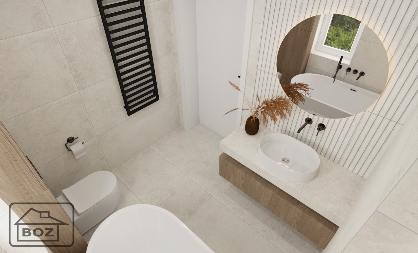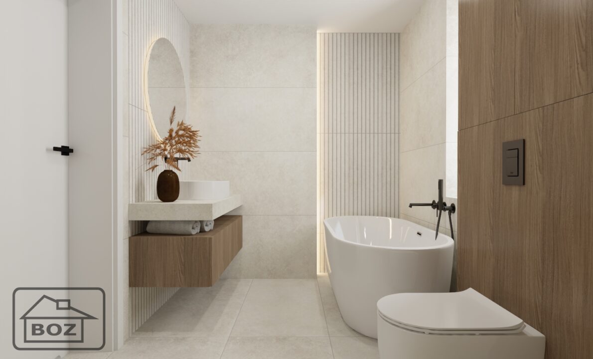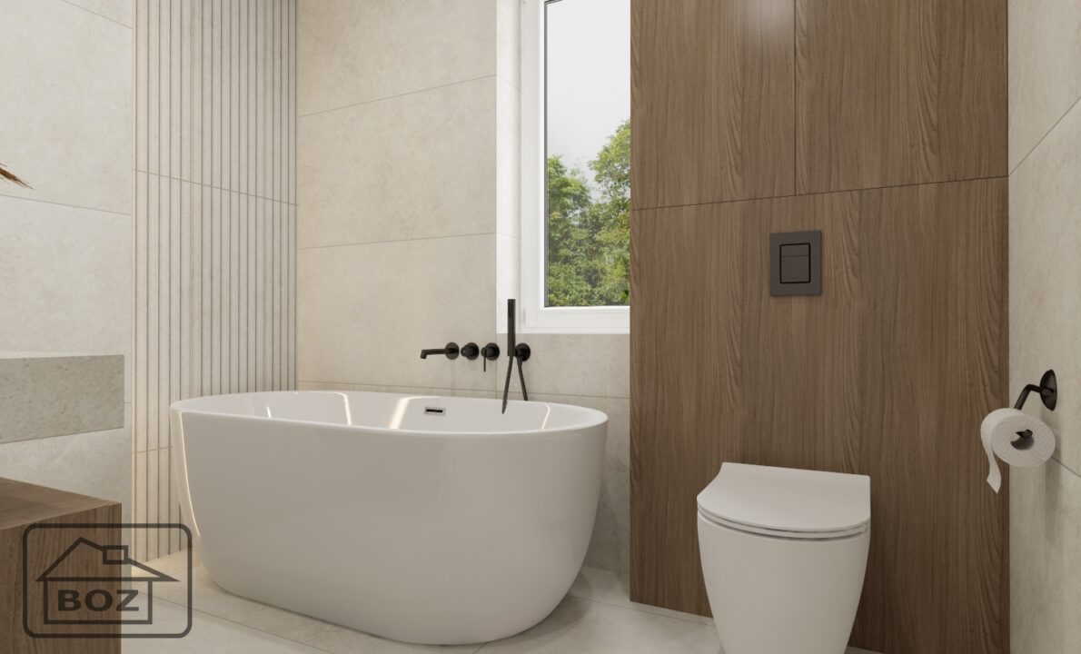 Całości dopełnia wolnostojąca wanna, która wprowadza do wnętrza atmosferę domowego SPA. Ustawiona w centralnym punkcie staje się prawdziwą ozdobą łazienki i zaproszeniem do odpoczynku po ciężkim dniu.