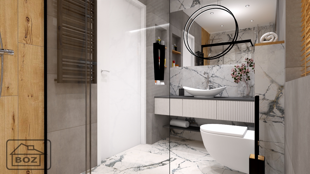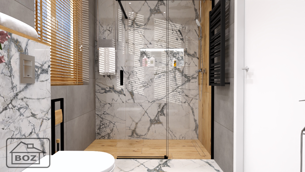 Do jasnego marmuru doskonale pasuje sosnowe drewno, które pomaga uporządkować wizualnie przestrzeń. Zastosowanie drewnopodobnych płytek w obszarze kabiny prysznicowej ociepla łazienkę. Aby wykorzystać dostępną przestrzeń we wnękach ściennych nad umywalką zainstalowaliśmy półki z wykończeniem o takim samym odcieniu jak przestrzeń prysznicowa.