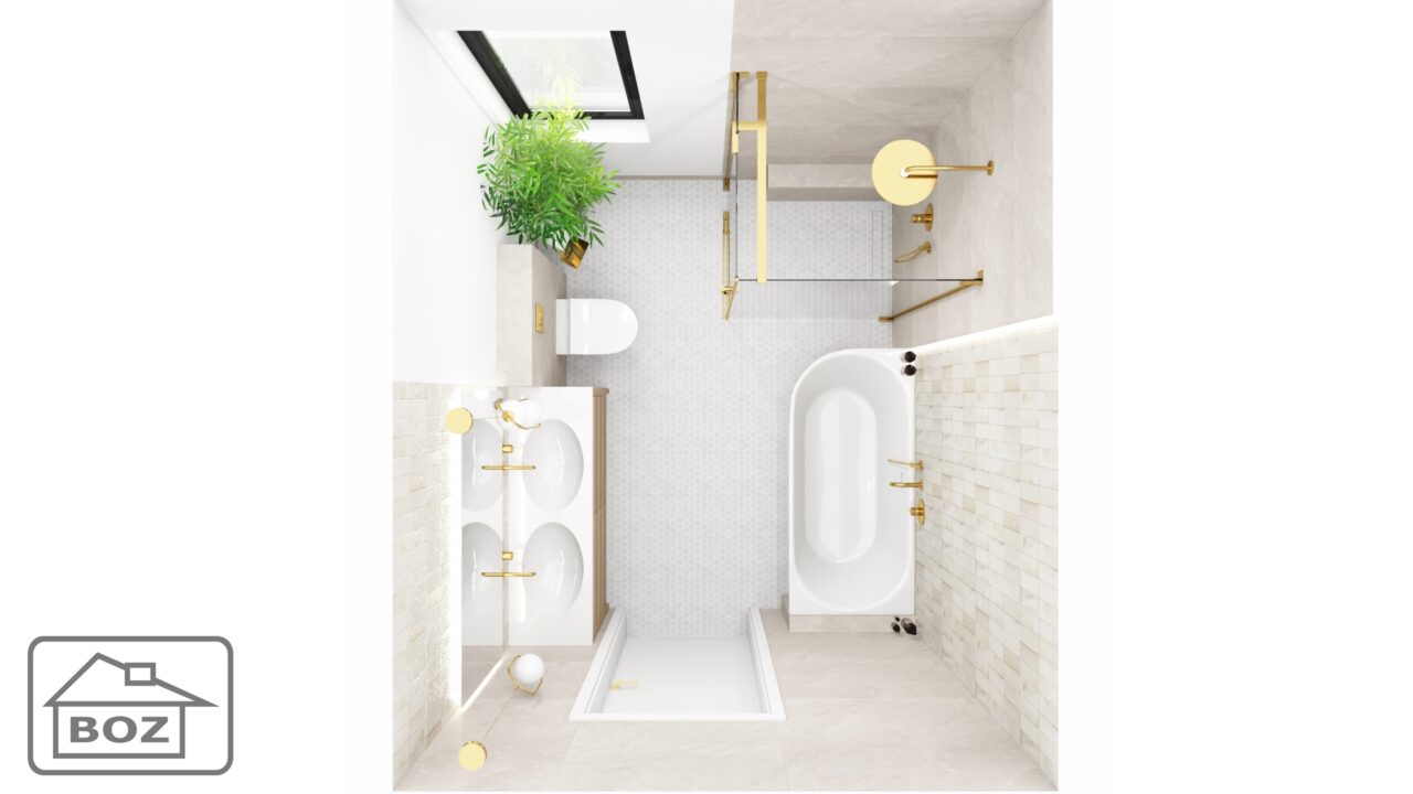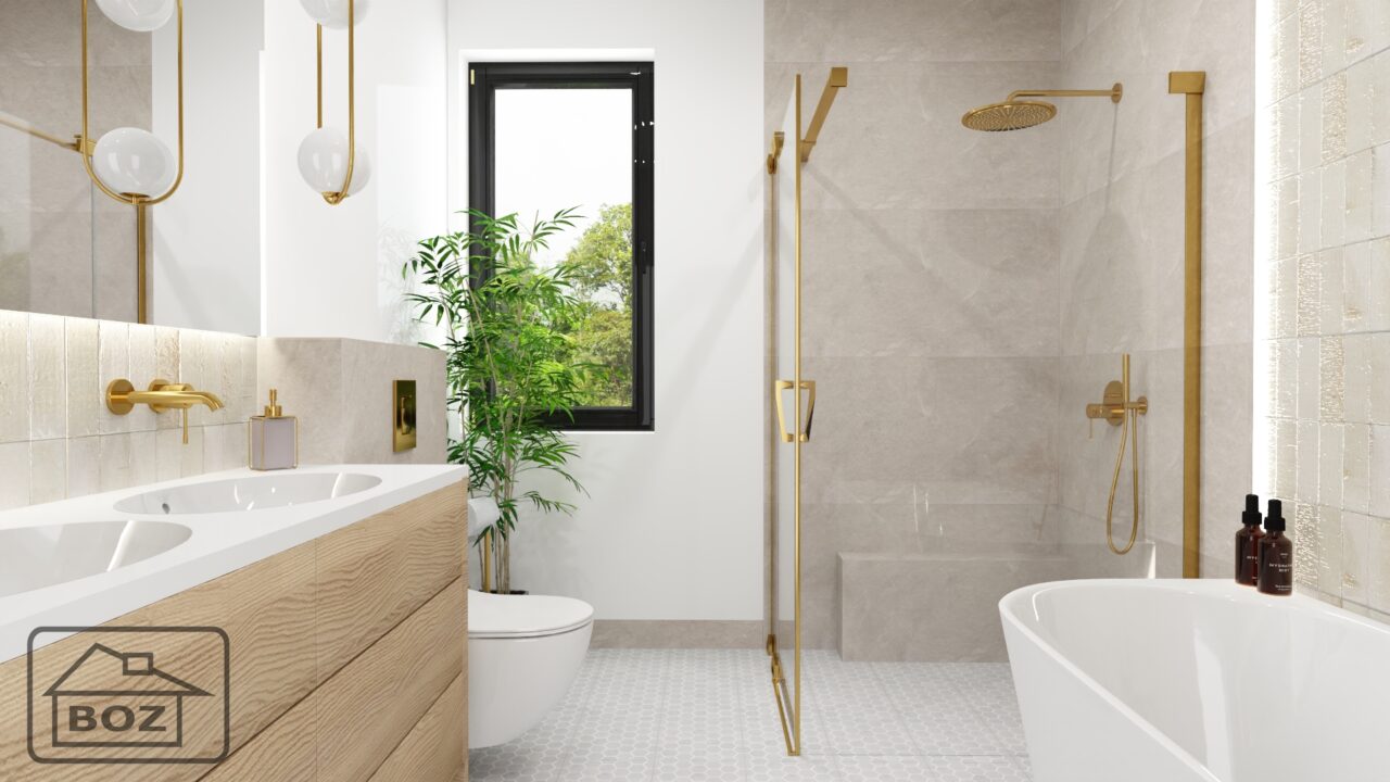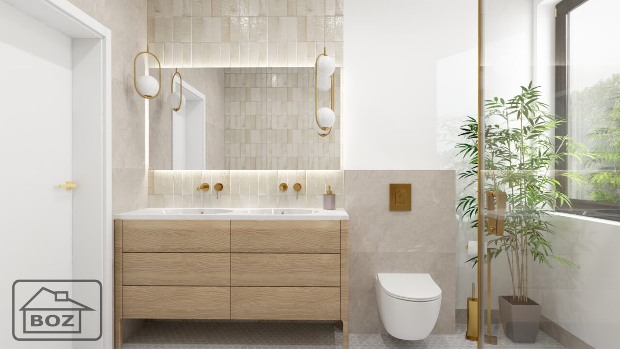 Tak zaprojektowane wnętrze łączy w sobie funkcjonalność z estetyką, tworząc harmonijną przestrzeń idealną do codziennego użytku. Połączenie płytek z różnych zakątków Europy, stonowana kolorystyka oraz złote dodatki sprawiają, że łazienka staje się nie tylko miejscem praktycznym, ale również wyrafinowanym azylem, w którym można poczuć się komfortowo i zrelaksować po długim dniu. Subtelna elegancja tej aranżacji to przykład na to, jak zbalansowane detale mogą nadać wnętrzu wyjątkowy charakter, tworząc spójną i harmonijną przestrzeń.