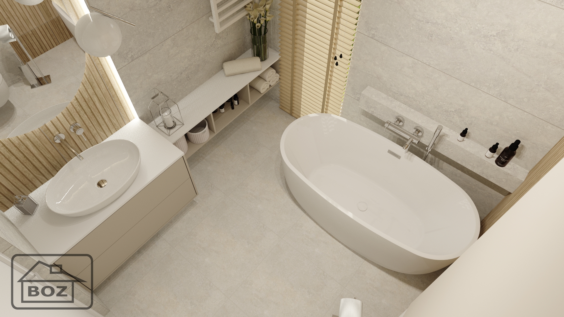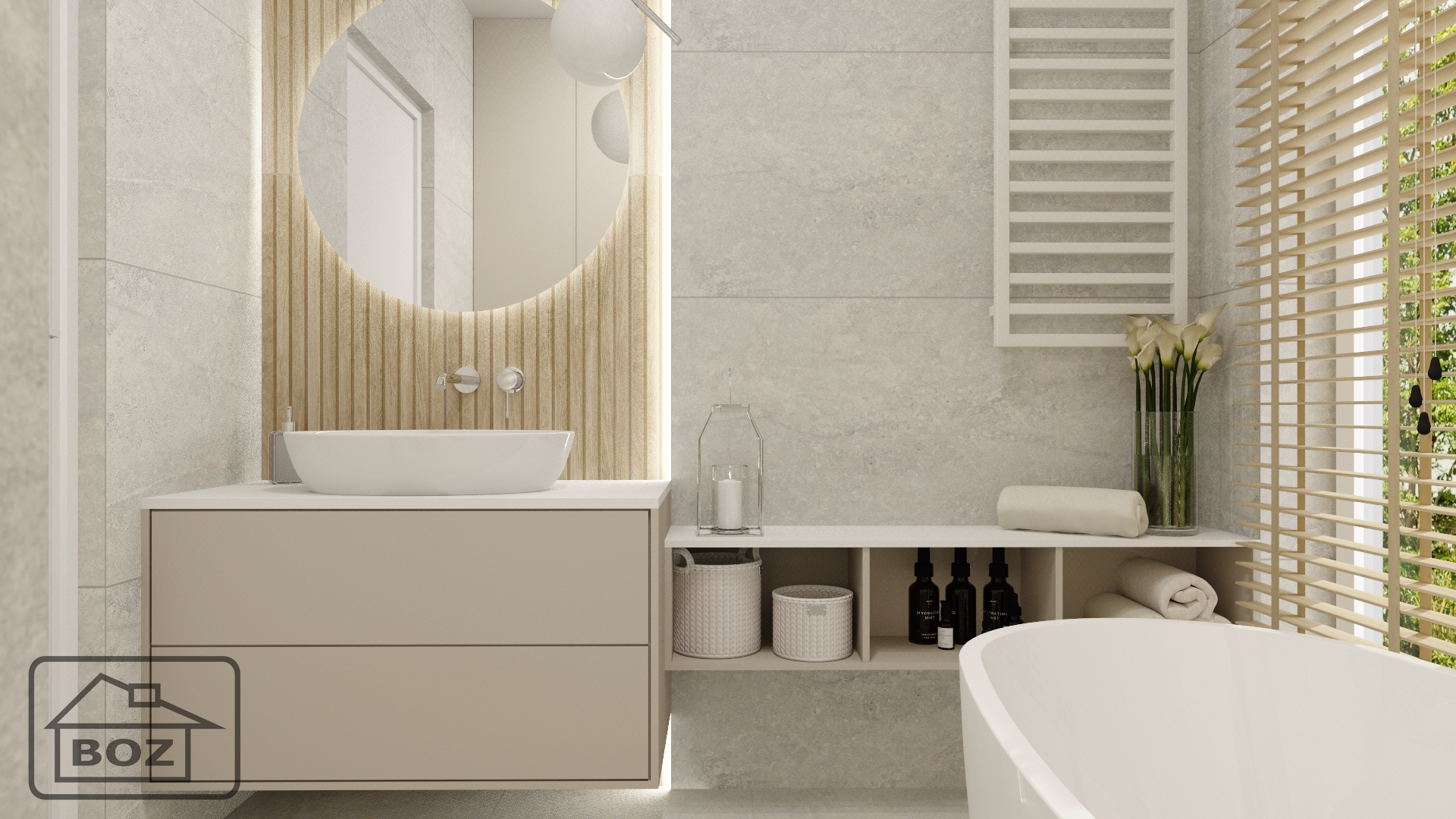 Główną zaletą wyboru wanny wolnostojącej jest jej wygoda i styl. Połączenie jej z nablatową umywalką, białym grzejnikiem i okrągłym lustrem nada łazience wyjątkowej elegancji. Co więcej, aby podkreślić relaksacyjny charakter wnętrza, warto postawić na dodatki wykonane z materiałów imitujących naturę, takich jak drewno czy kamień, np. świeczniki, mydelniczki czy półki na kosmetyki. Dzięki temu stworzymy spójną aranżację łazienki, która zachęci do relaksu i odprężenia.