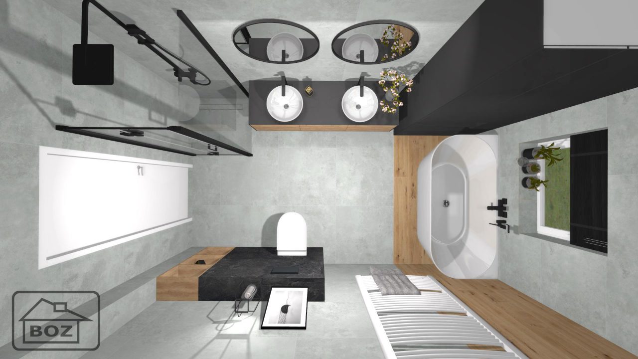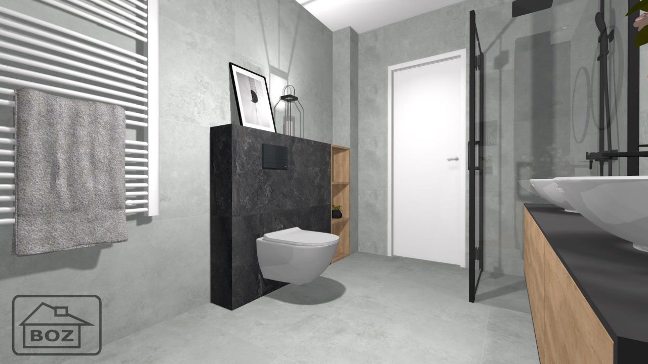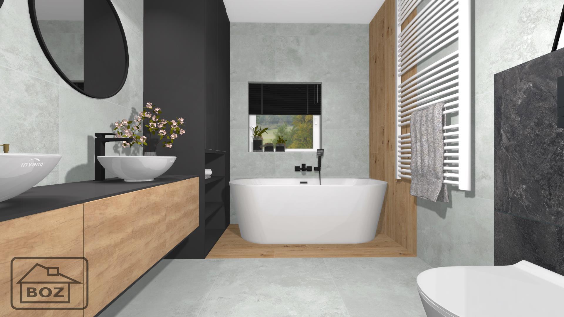 Jasne ściany, jeden z głównych elementów aranżacji sprawiają, że wnętrze wydaje się obszerniejsze. Płytki łazienkowe Tubądzin w odcieniu zgaszonej szarości dominują w pomieszczeniu. Aby ożywić wnętrze małej łazienki z wanną zestawiliśmy je z kontrastową, matową czernią. Drewniane wstawki ocieplają wnętrze i służą do wydzielenia przestrzeni kąpielowej.