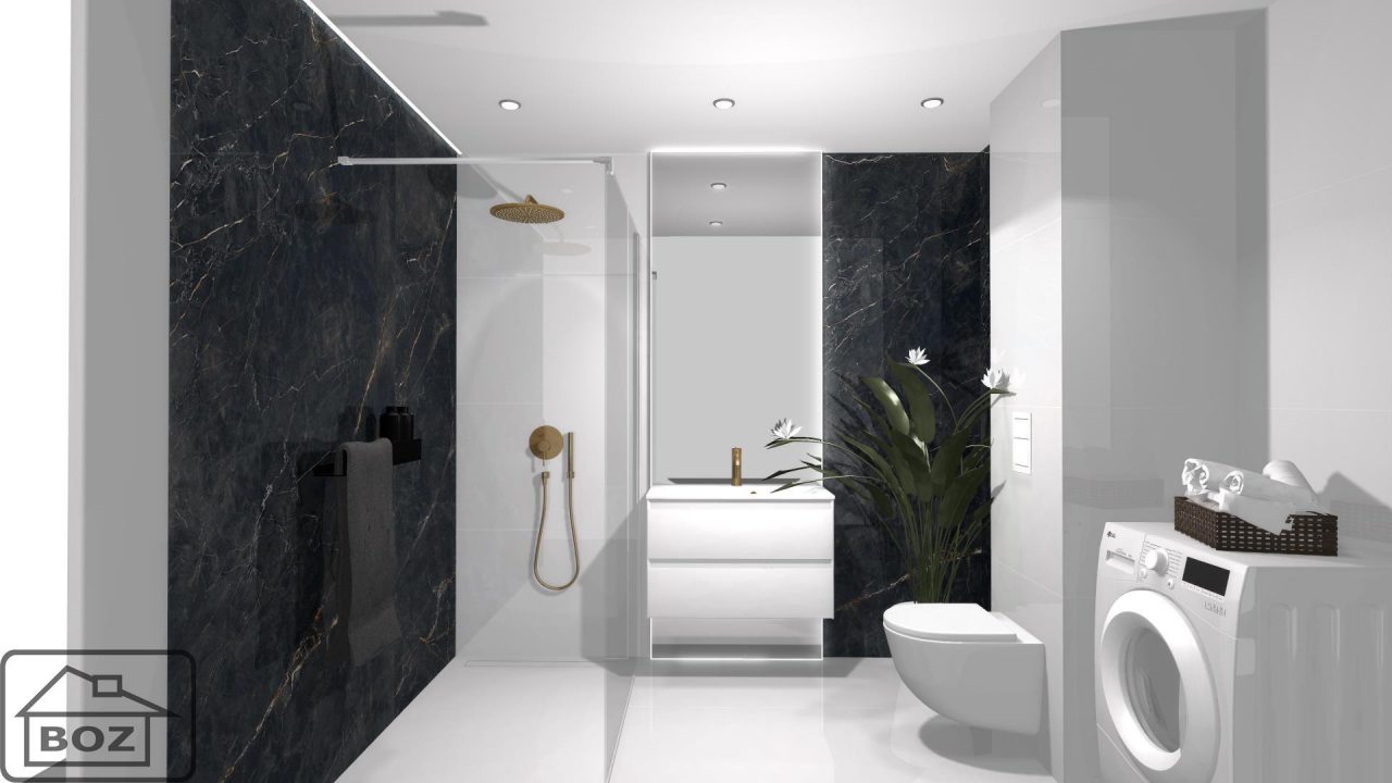 Połączenie czerni i bieli to klasyka w aranżacji wnętrz. Dzięki temu kontrastowemu zestawieniu łazienka zyskuje nieco charakteru i drapieżności. Przełamaniem kontrastowej klasyki są, w tym przypadku, płytki imitujące marmurowy kamień przeplatany złotymi żyłami. Aby nie przytłoczyć wnętrza, czarne płytki zajmują niewielką część ścian.
