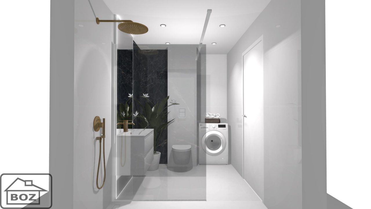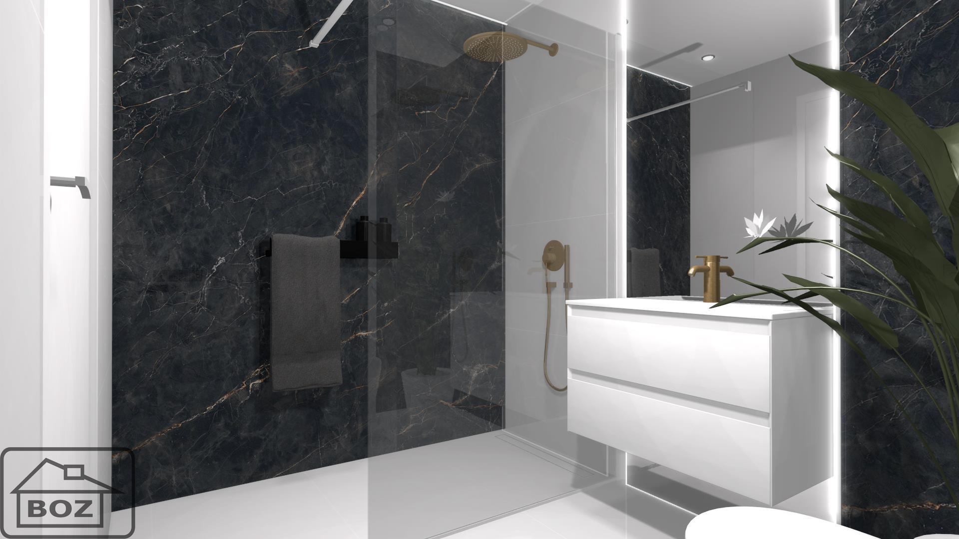 Ciekawym dodatkiem do takiego wnętrza jest złota armatura Grohe Essence, nadająca luksusowe wykończenie. W tej aranżacji postawiliśmy na przestronność i dlatego wybraliśmy prysznic. Przeszklona ścianka zapewnia wrażenie głębi pomieszczenia.